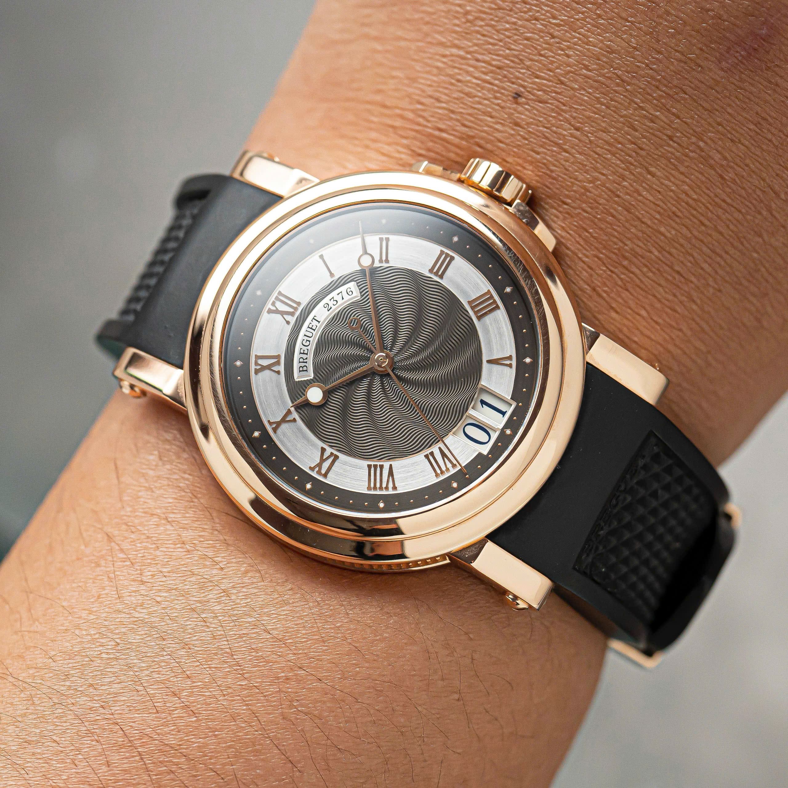 Hoàn thiện tổng thể là dây cao su đen họa tiết dập nổi cùng khóa cài vàng hồng, đem đến sự thoải mái và độ bền vượt trội, đồng thời làm nổi bật tinh thần “thể thao xa xỉ” đặc trưng của Breguet.