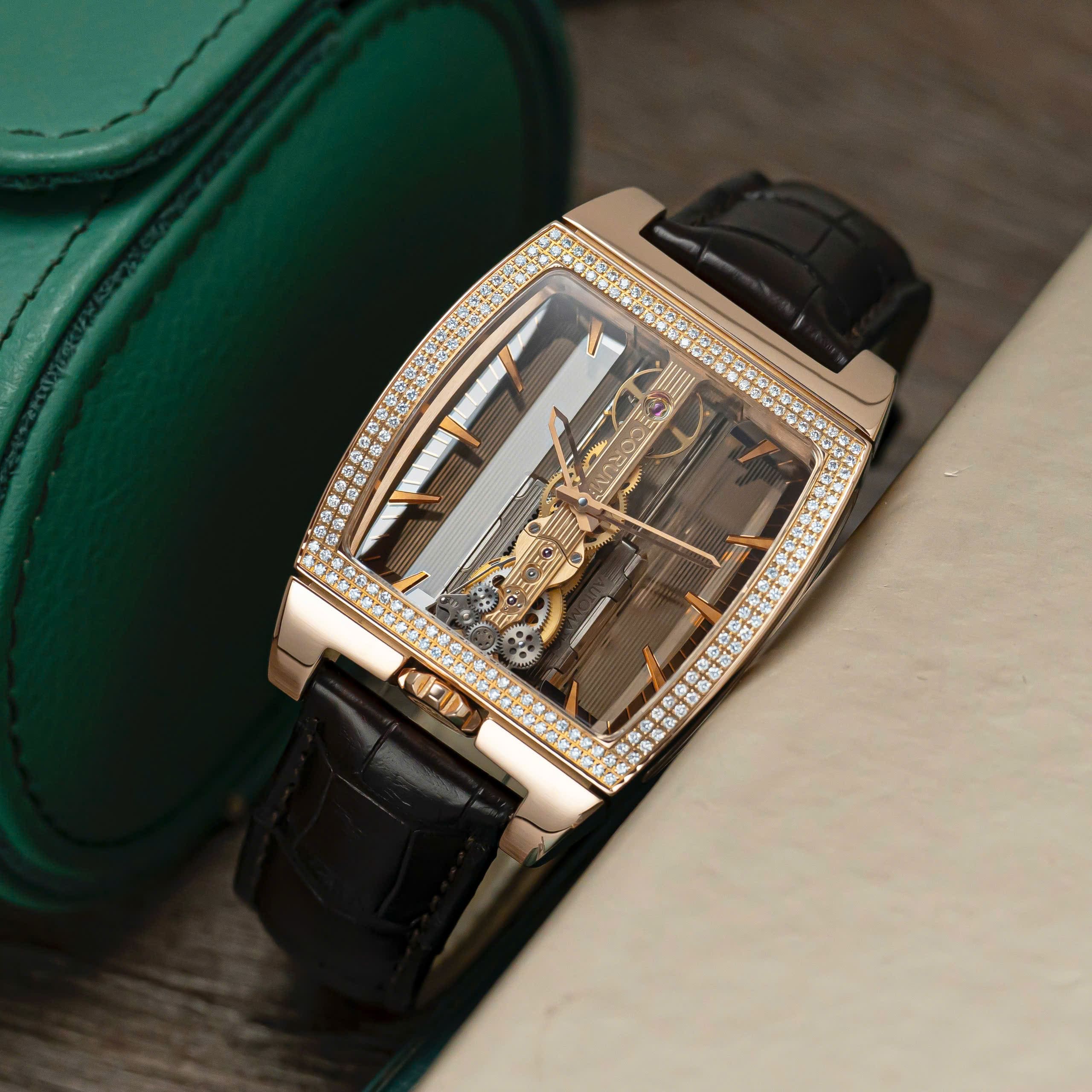- Thiết kế đặc trưng với bộ máy Golden Bridge sắp đặt dọc trong bộ vỏ vàng hồng 18K, tạo vẻ đẹp kiến trúc độc bản.