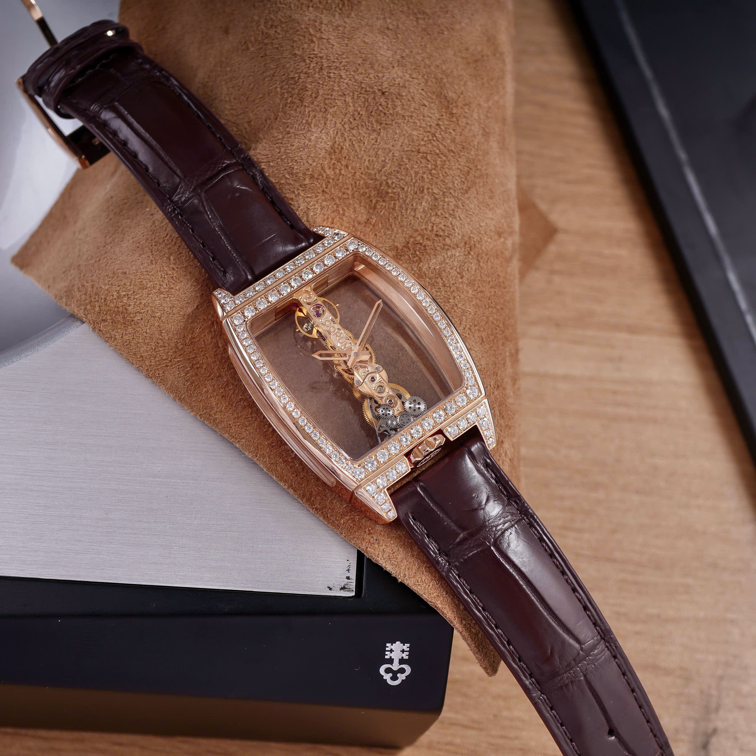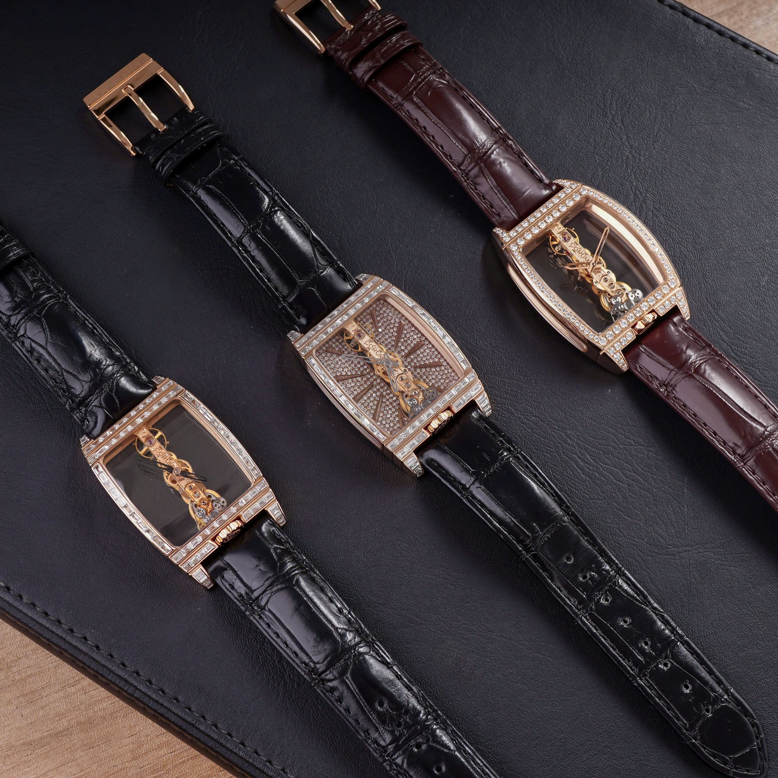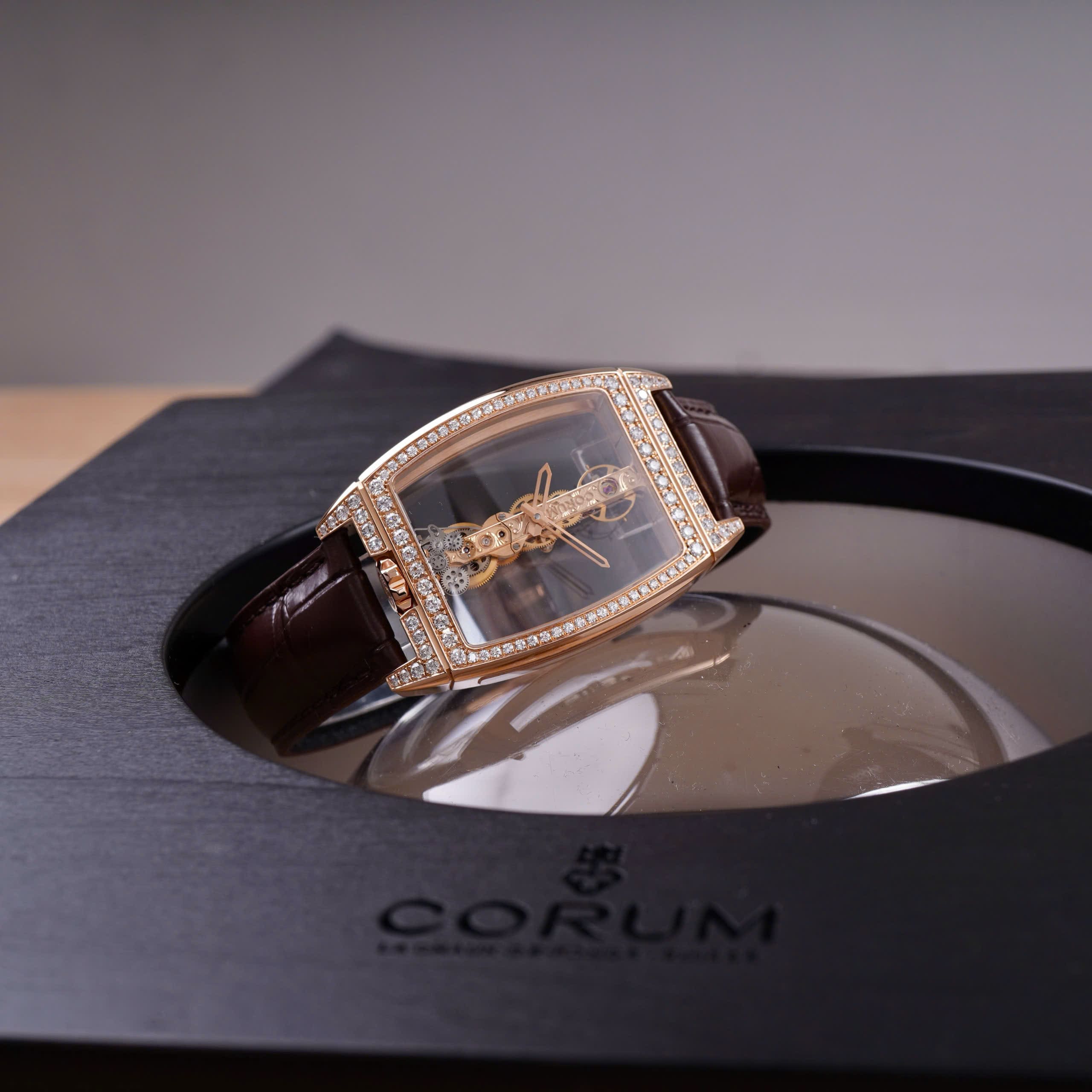 - Bộ máy cơ lên cót tay Corum CO 113, nổi tiếng với kiến trúc dọc đặc trưng và độ hoàn thiện nghệ thuật.