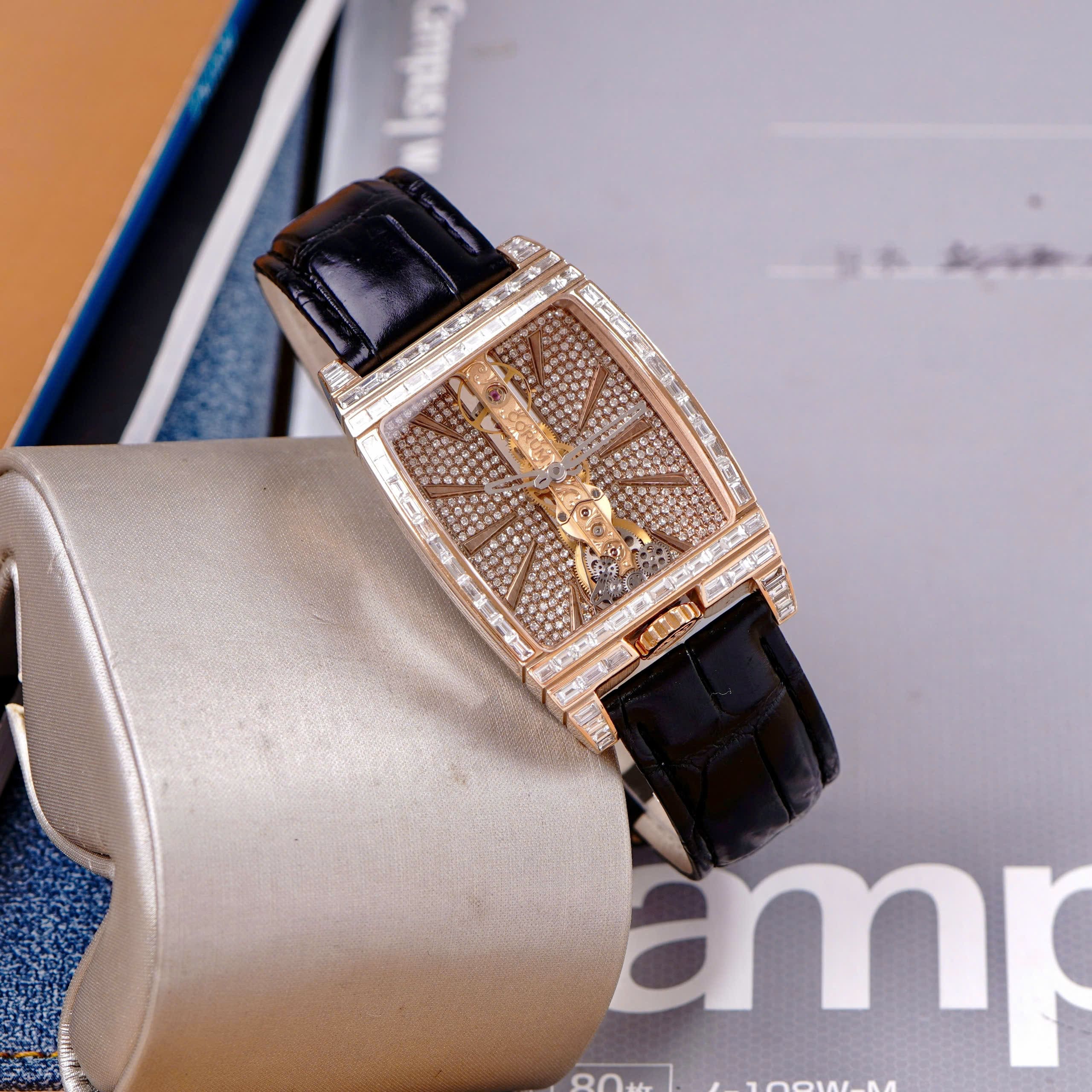 - Toàn bộ thân vỏ, vành bezel và càng nối dây được độ full kim cương baguette & kim cương tấm theo tiêu chuẩn high-end jewelry, tạo hiệu ứng lấp lánh đầy uy lực.