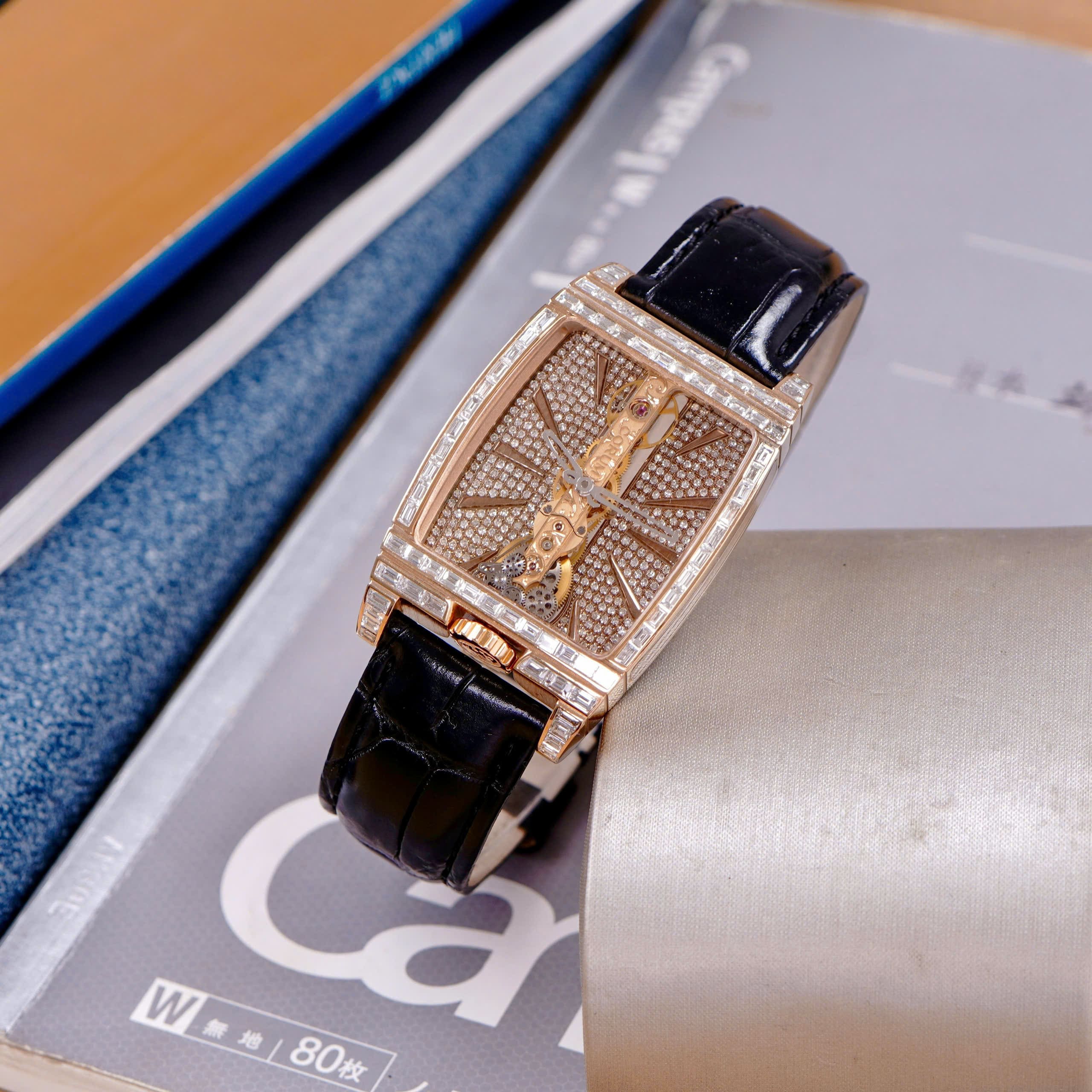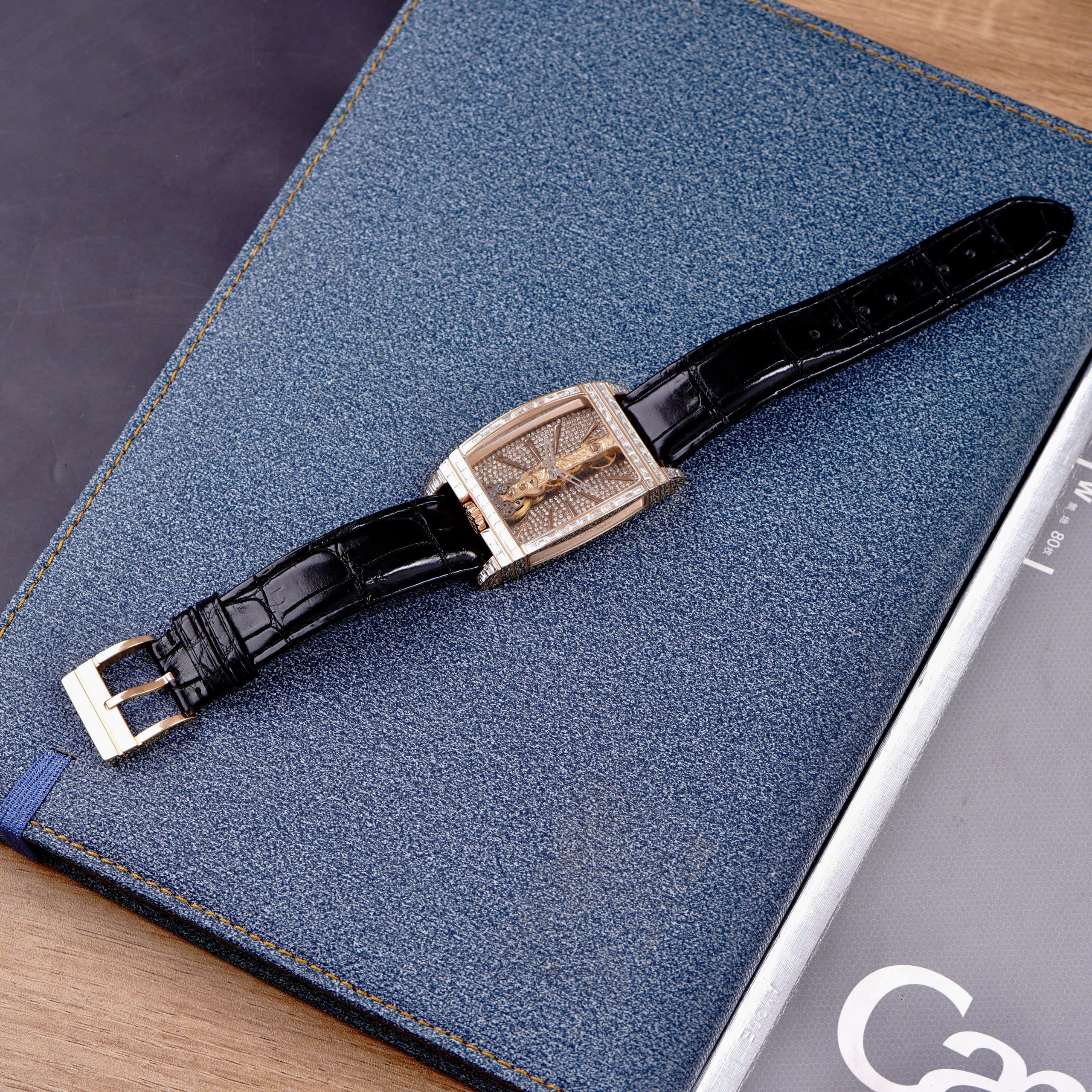 - Dây đeo da cá sấu đen sang trọng, làm nổi bật tổng thể vàng hồng và kim cương.