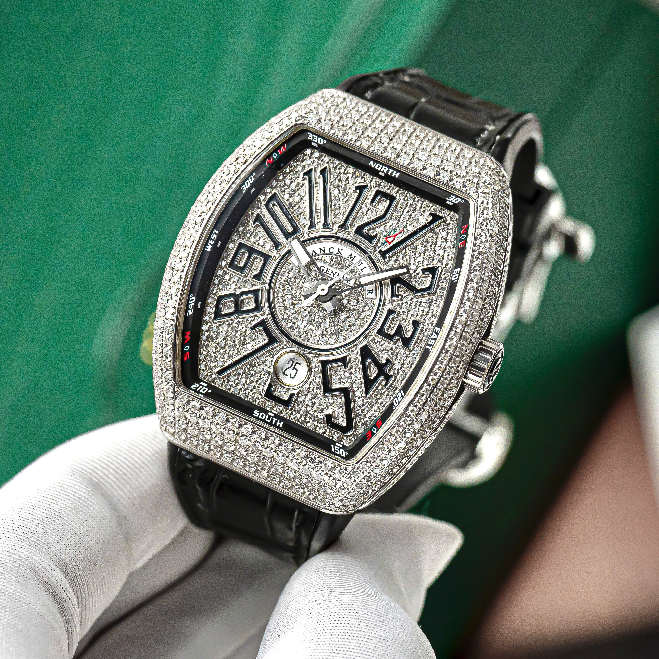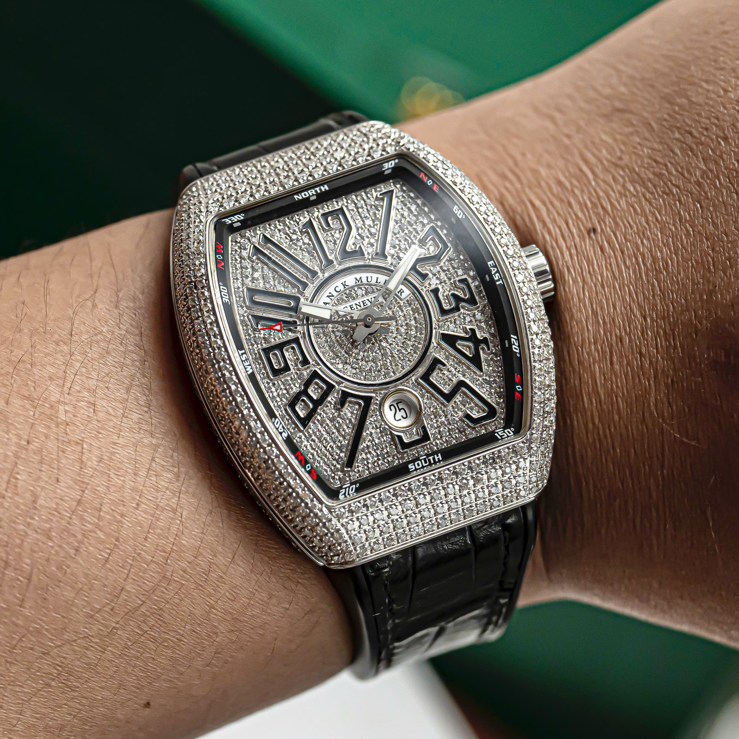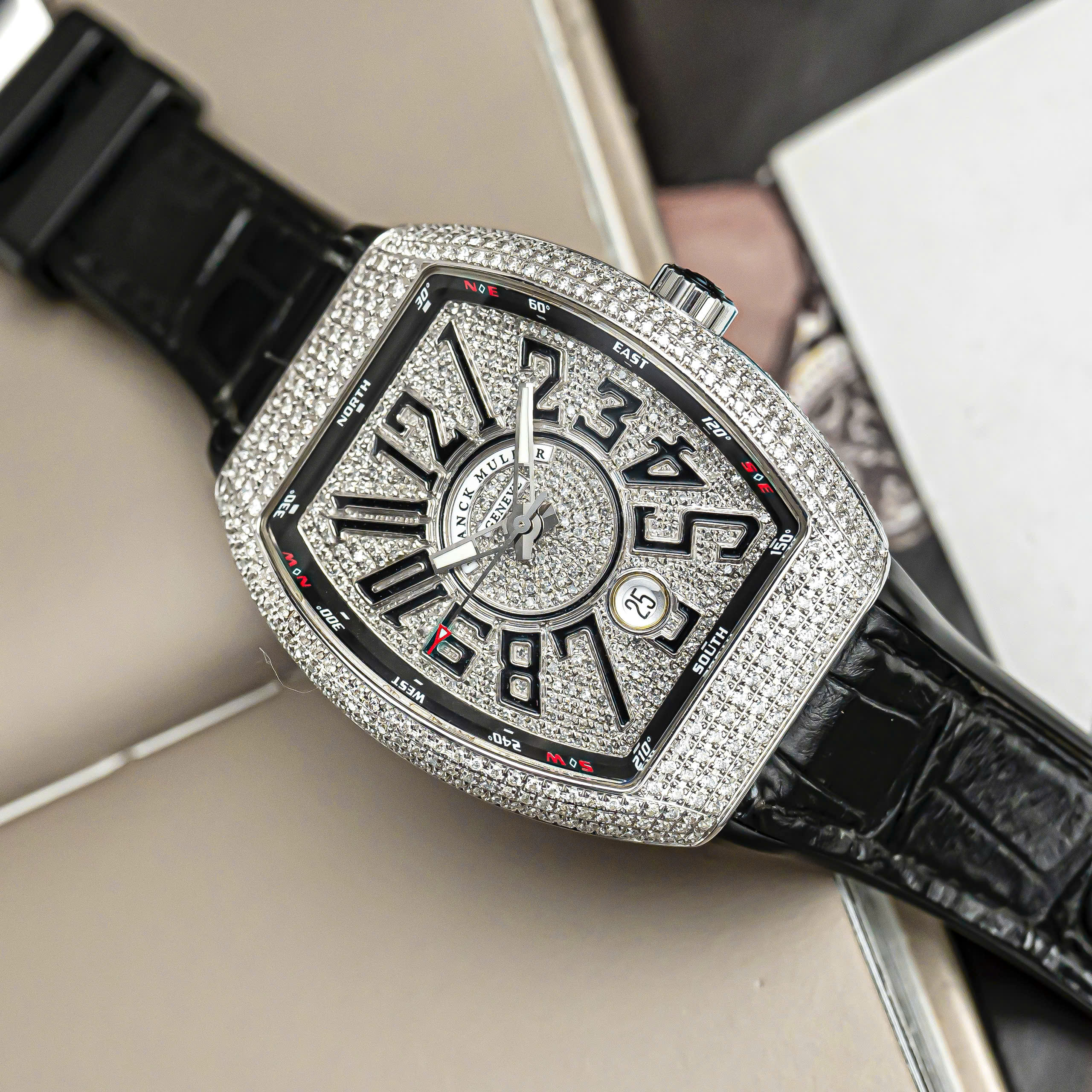– Mặt số full diamond, cọc số Arabic nổi 3D đặc trưng Franck Muller, kết hợp vòng compass thể thao cá tính.