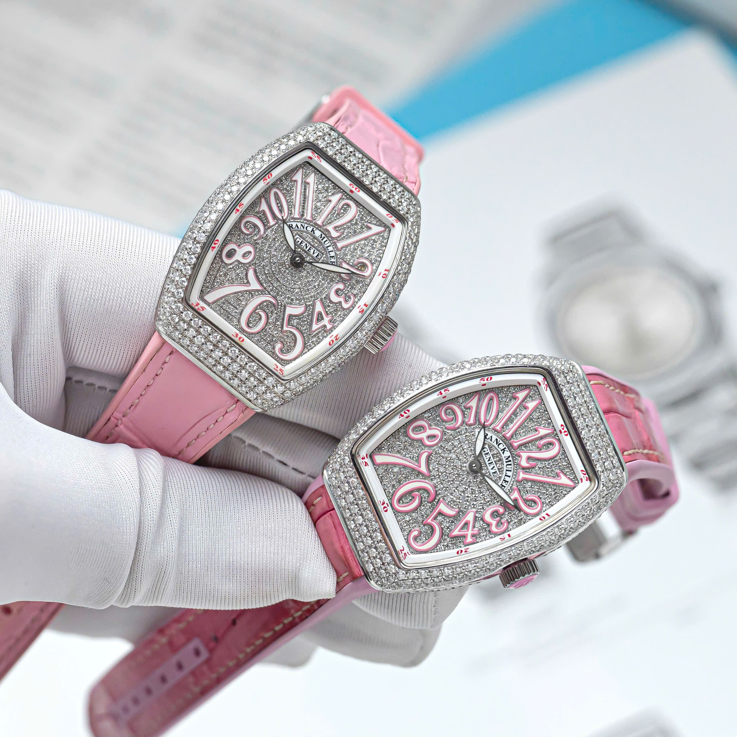 Chiếc Franck Muller Vanguard V32 này mang đến sự kết hợp hoàn hảo giữa vẻ đẹp nữ tính và sự xa hoa đỉnh cao. Toàn bộ vỏ đồng hồ được nạm kín kim cương, tạo nên hiệu ứng lấp lánh ấn tượng. Mặt số pavé kim cương tiếp tục tôn vinh nghệ thuật chế tác tinh xảo, trong khi bộ cọc số Ả Rập phủ men hồng mang phong cách trẻ trung, thời thượng và cực kỳ bắt mắt.