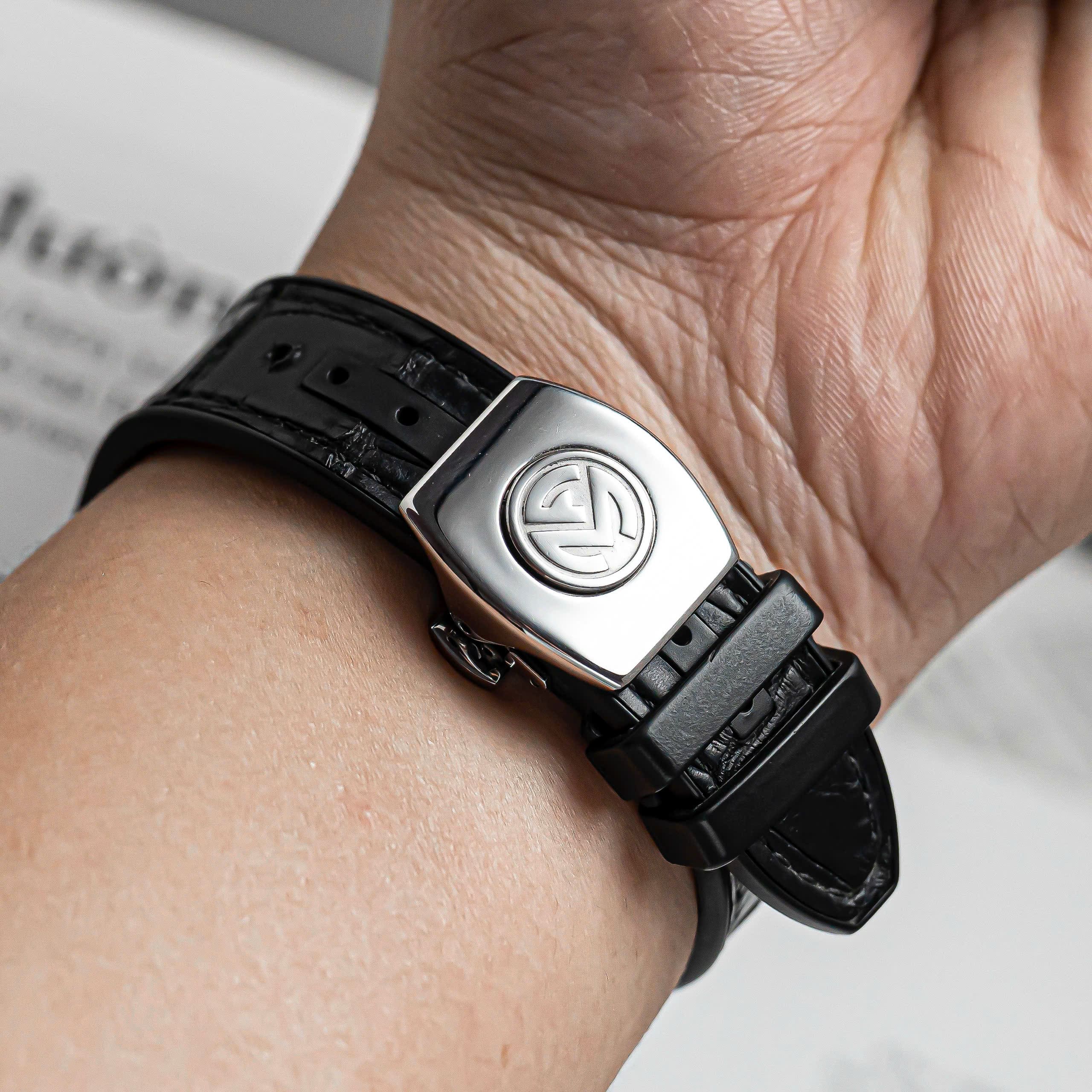 - Dây da cá sấu đen, khóa gập thép chắc chắn.