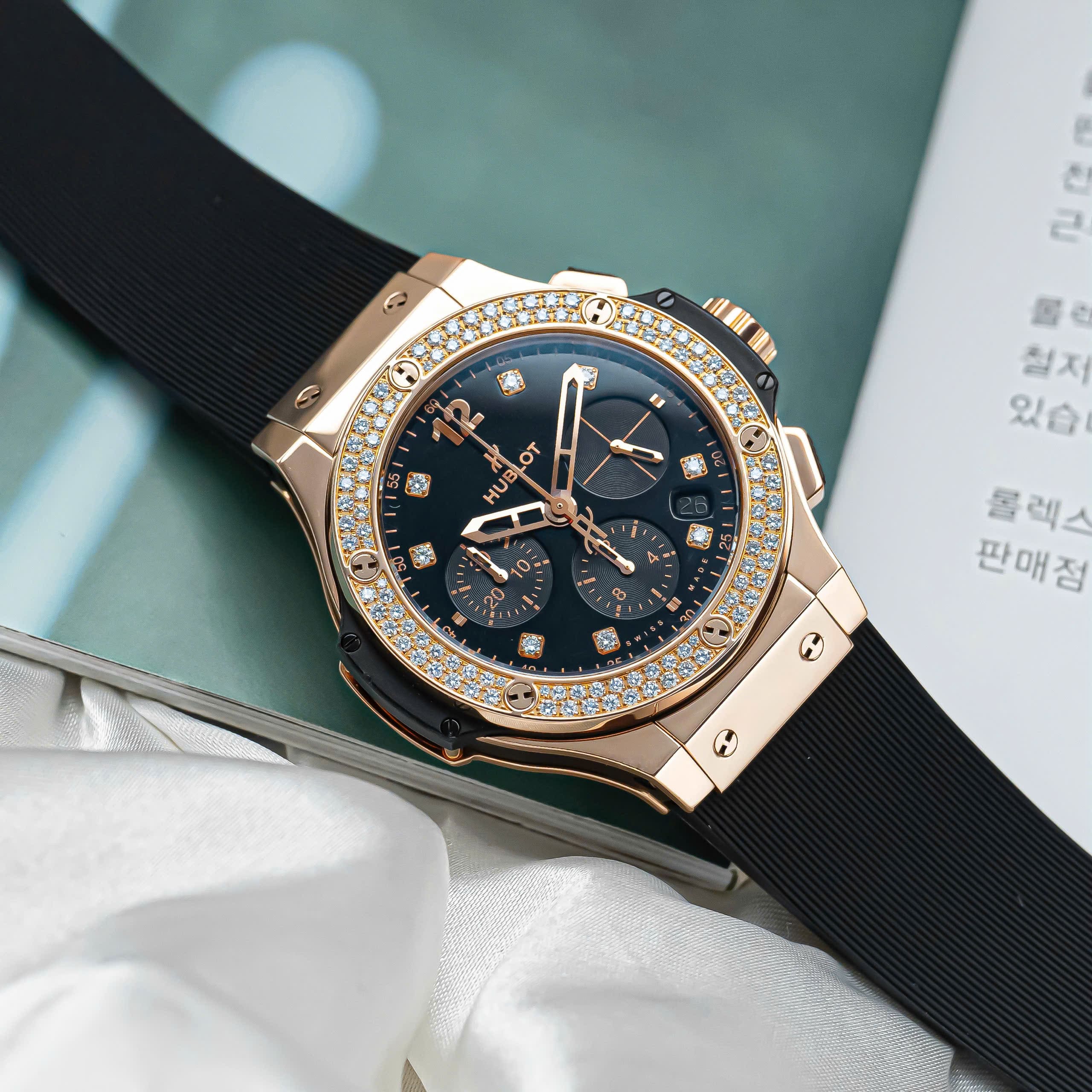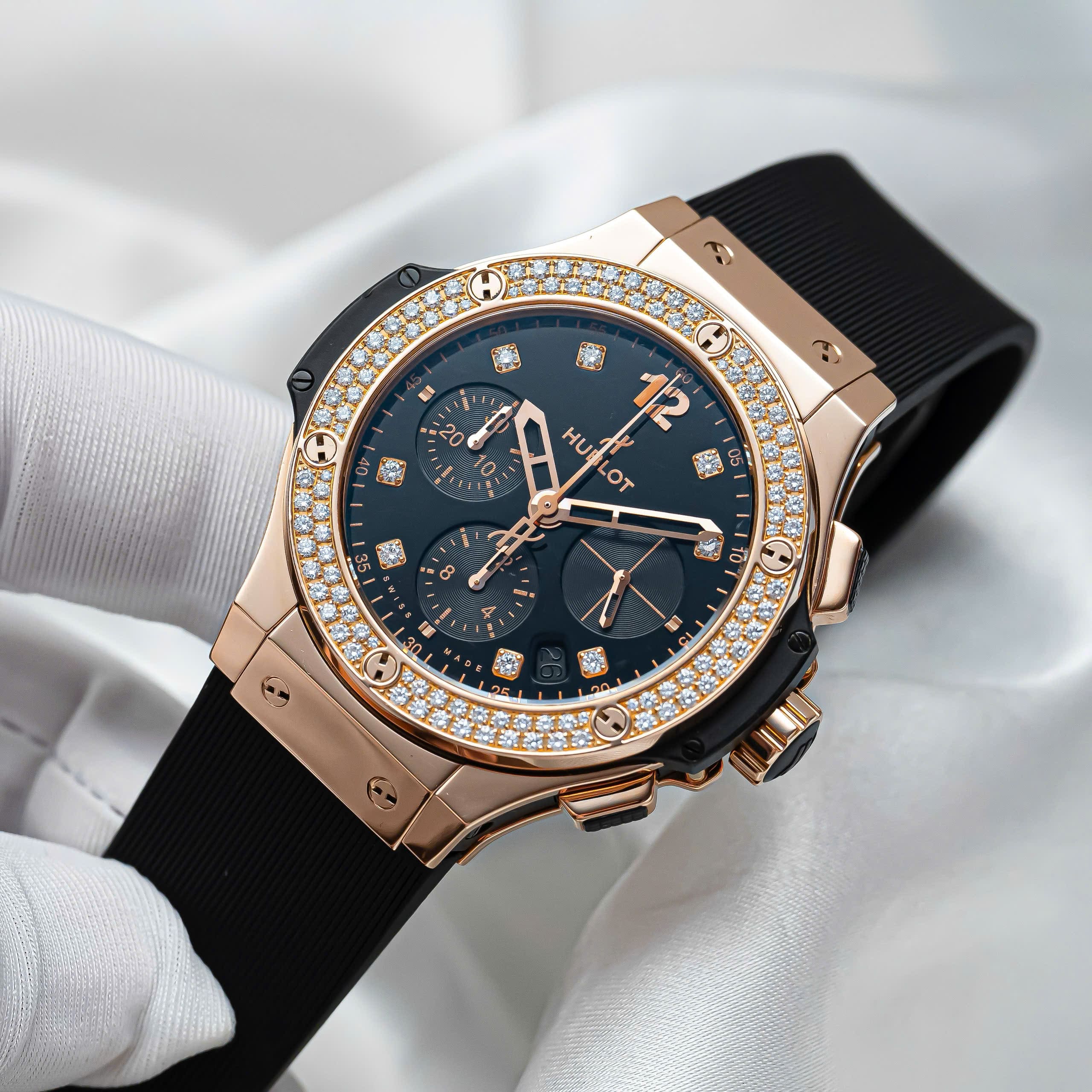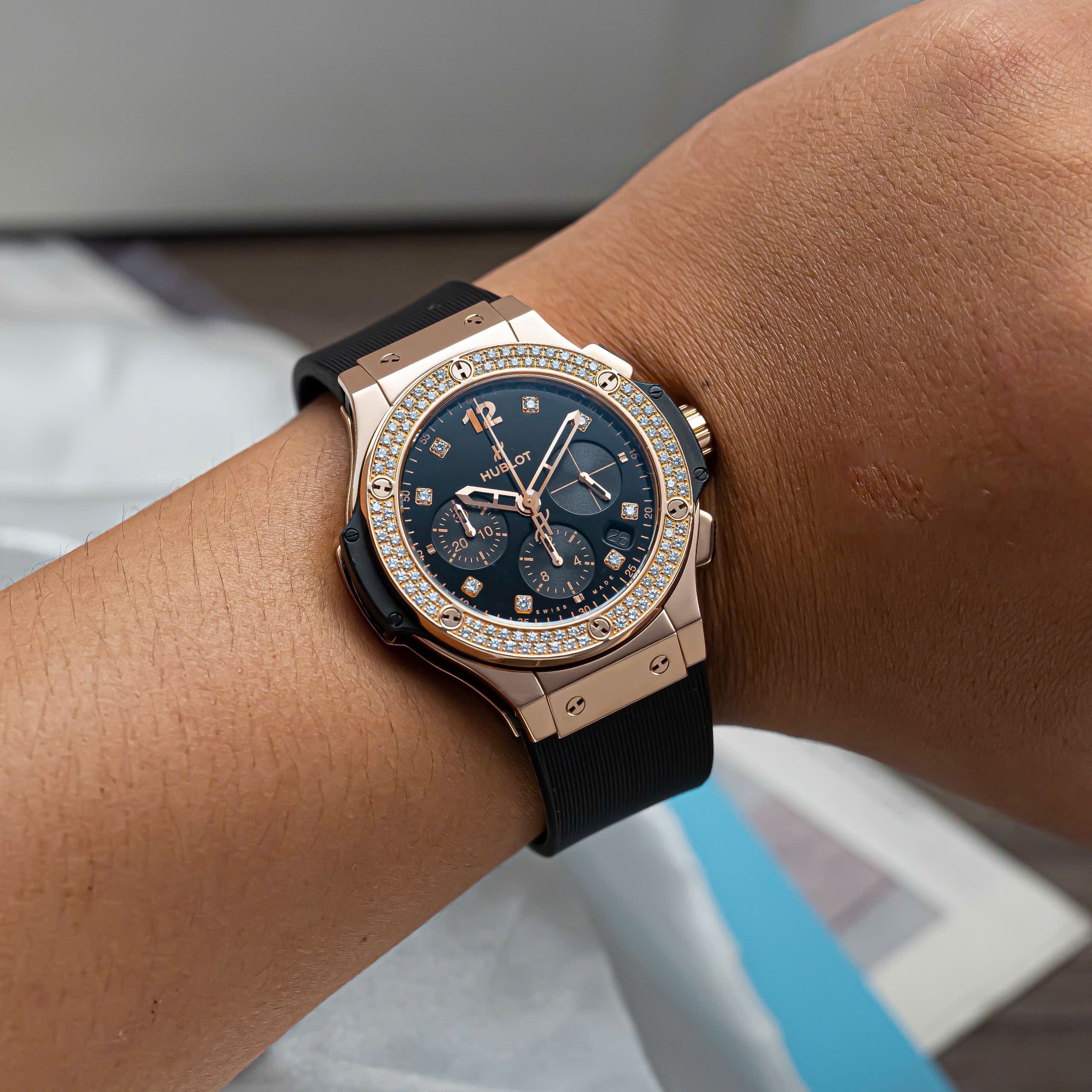 Chiếc Hublot Big Bang Gold Diamonds 41mm Ref. 341.PX.1280.VR.1104 là sự kết hợp hoàn hảo giữa sự xa hoa và thể thao. Bộ vỏ vàng hồng 18K kết hợp với vành bezel nạm kim cương rực rỡ, mang đến vẻ đẹp lộng lẫy nhưng vẫn mạnh mẽ. Mặt số đen sâu hút, điểm xuyết các cọc số kim cương và ba mặt số phụ chronograph, tạo nên bố cục cân đối và tiện dụng. Bộ máy automatic chính xác cùng dây cao su đen cao cấp mang lại trải nghiệm đeo thoải mái, bền bỉ. Đây là lựa chọn lý tưởng cho những ai yêu thích sự sang trọng nổi bật nhưng vẫn muốn giữ chất thể thao khỏe khoắn của Hublot.