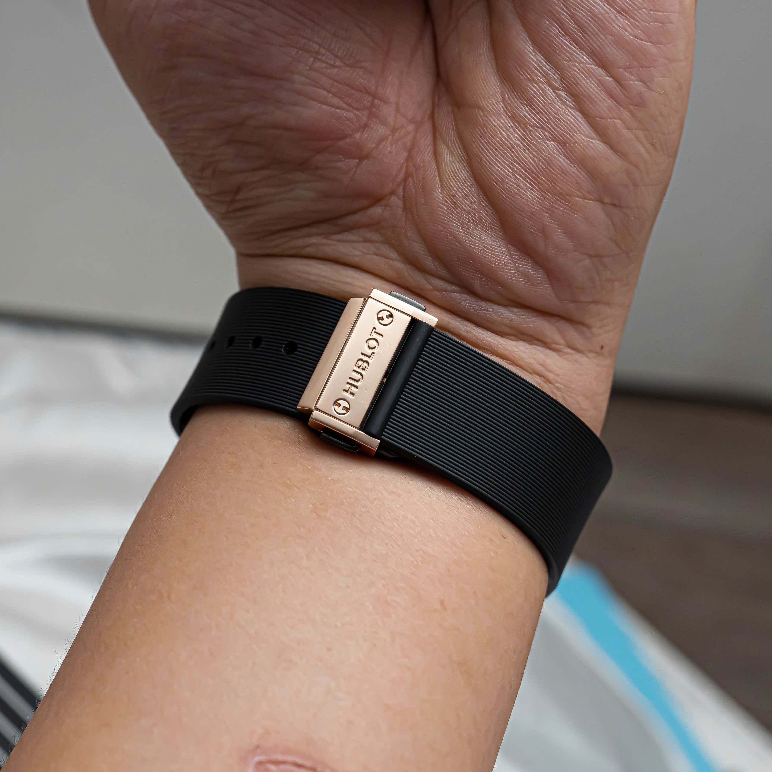 - Dây cao su đen ôm tay thoải mái, phong cách thể thao hiện đại