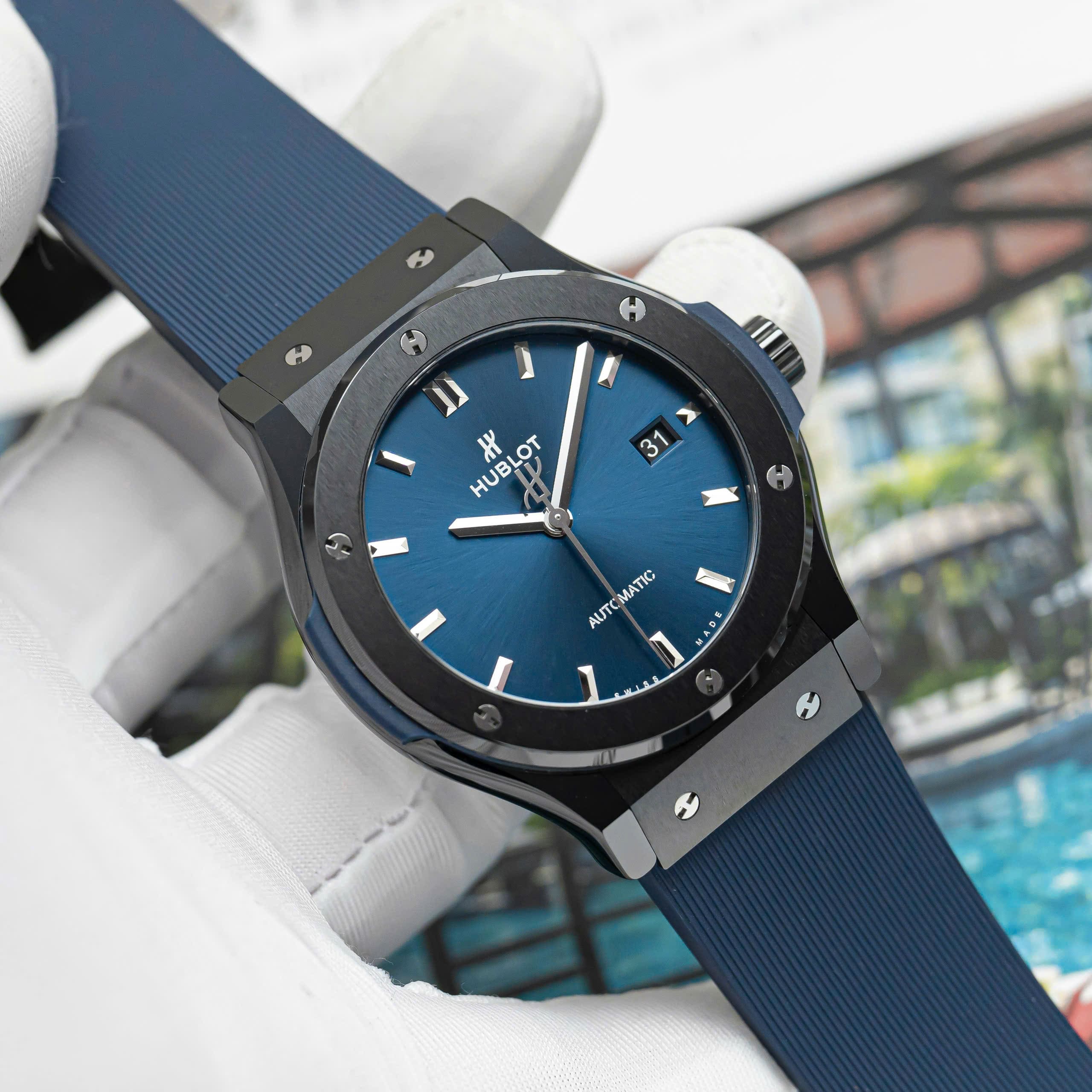 Hublot Classic Fusion Ceramic Blue 42mm Ref. 542.CM.7170.RX thể hiện trọn vẹn tinh thần “Art of Fusion” – nghệ thuật kết hợp giữa vật liệu tiên tiến và phong cách tối giản đương đại. Lớp vỏ gốm đen bóng được xử lý tỉ mỉ bằng công nghệ cao, vừa mang vẻ mạnh mẽ nam tính, vừa đảm bảo khả năng chống trầy xước vượt trội.