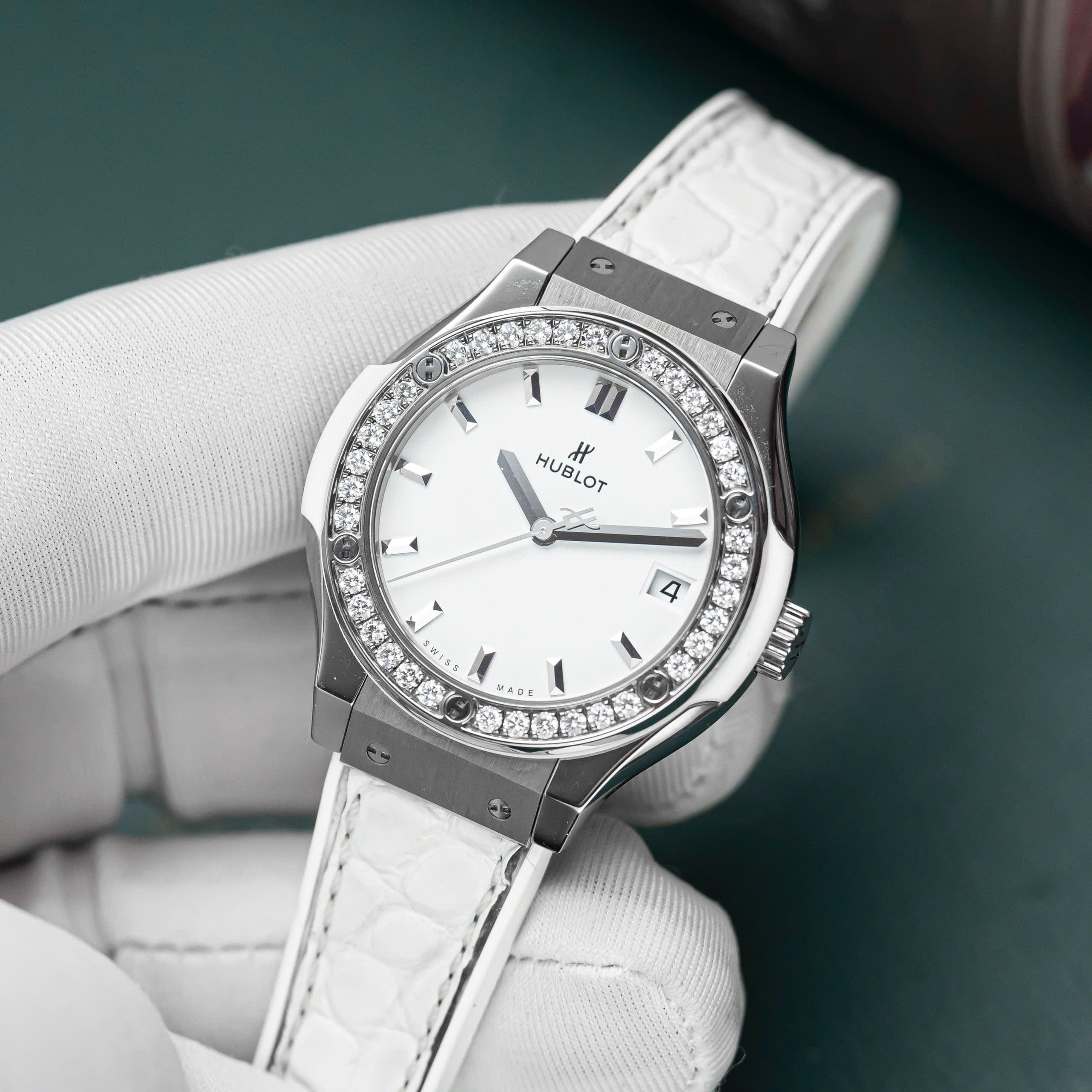 Bên trong, đồng hồ vận hành bằng bộ máy quartz Thụy Sĩ – biểu tượng của độ chính xác và sự tiện lợi, giúp người đeo an tâm trong mọi hoàn cảnh. Dây da cá sấu trắng cao cấp được lót cao su tự nhiên bên trong – một sáng tạo độc quyền của Hublot – vừa tăng độ bền, vừa mang lại cảm giác mềm mại, linh hoạt khi đeo.