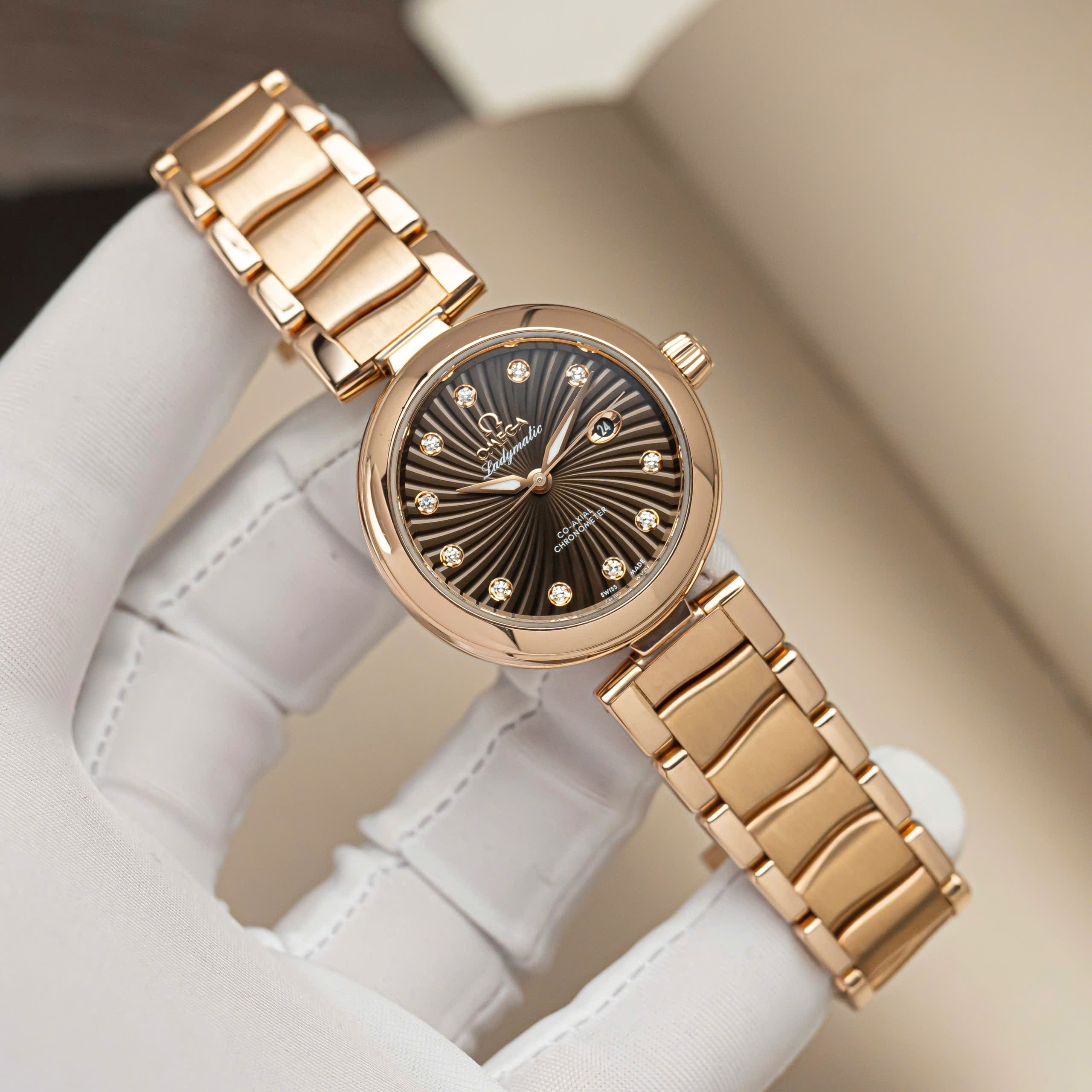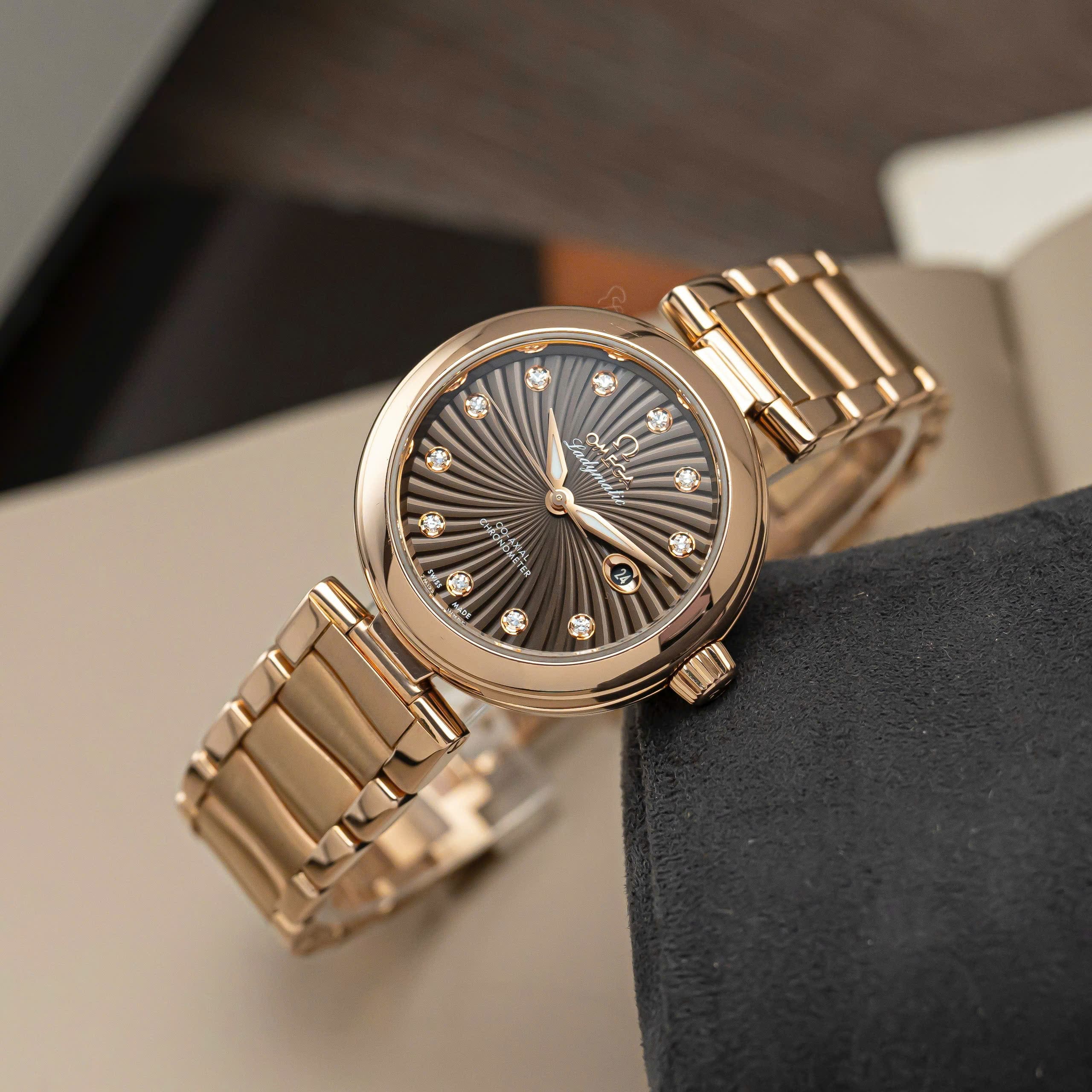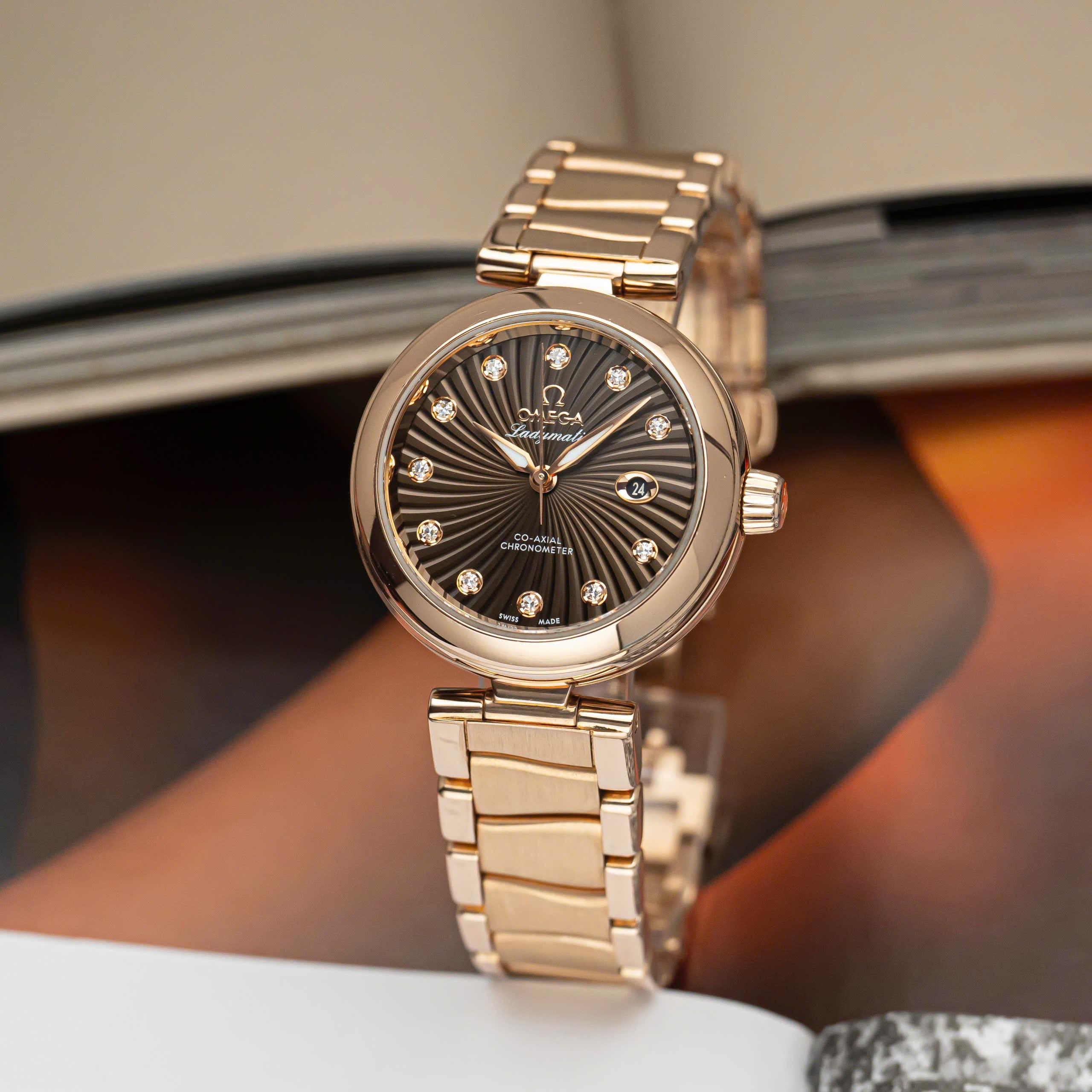 Mang trong mình tinh thần thanh lịch thuần khiết của dòng De Ville, Omega Ladymatic 34mm Ref. 425.60.34.20.63.001 là một trong những biểu tượng của vẻ đẹp nữ tính trong thế giới đồng hồ cơ học. Thiết kế vỏ và dây vàng hồng 18K Sedna™ tỏa sáng rực rỡ dưới mọi ánh nhìn, kết hợp hài hòa cùng mặt số nâu chocolate sang trọng, điểm xuyết 11 viên kim cương lấp lánh.