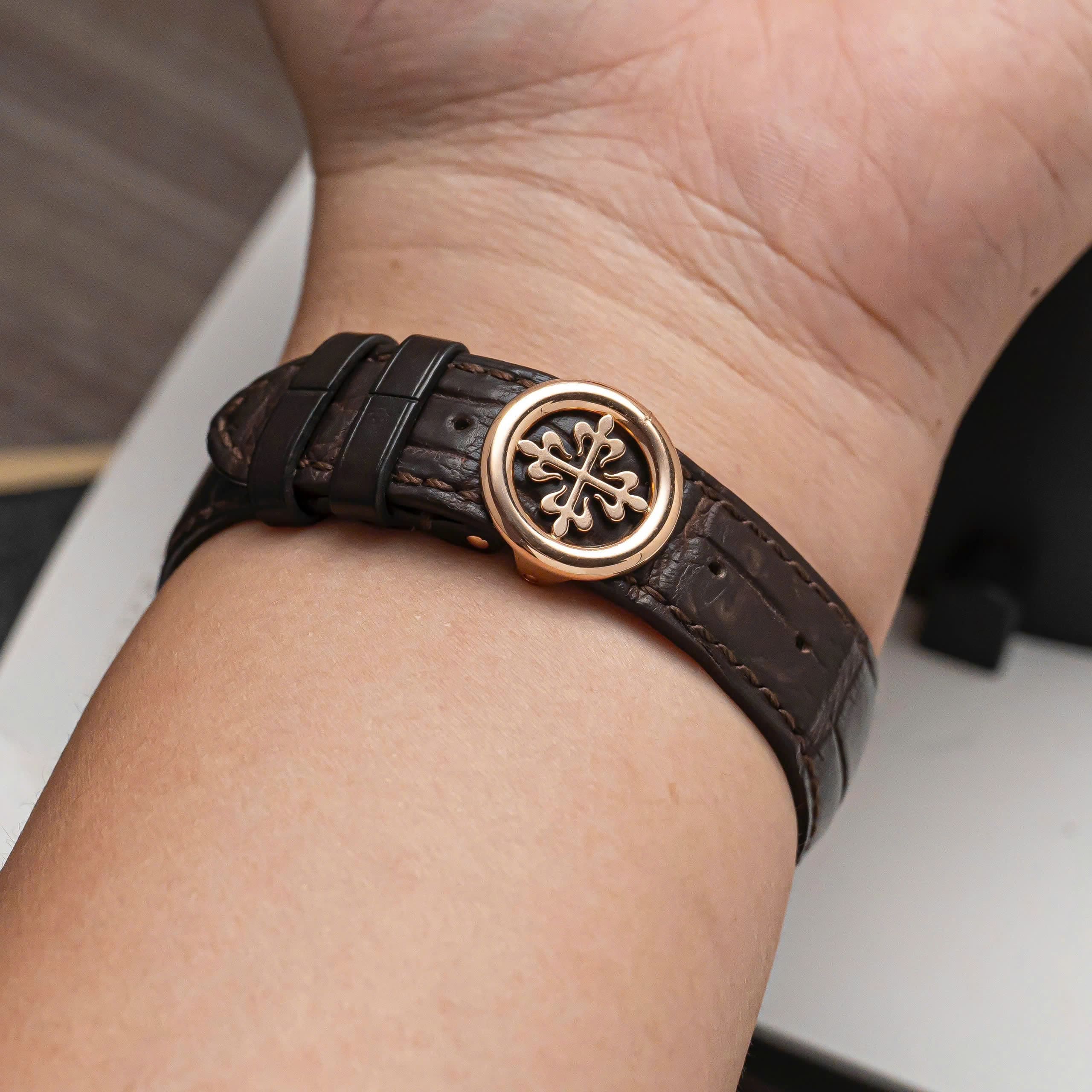 - Dây da cá sấu nâu thủ công kết hợp khóa gập vàng hồng, hoàn thiện phong thái dress watch sang trọng và khác biệt.