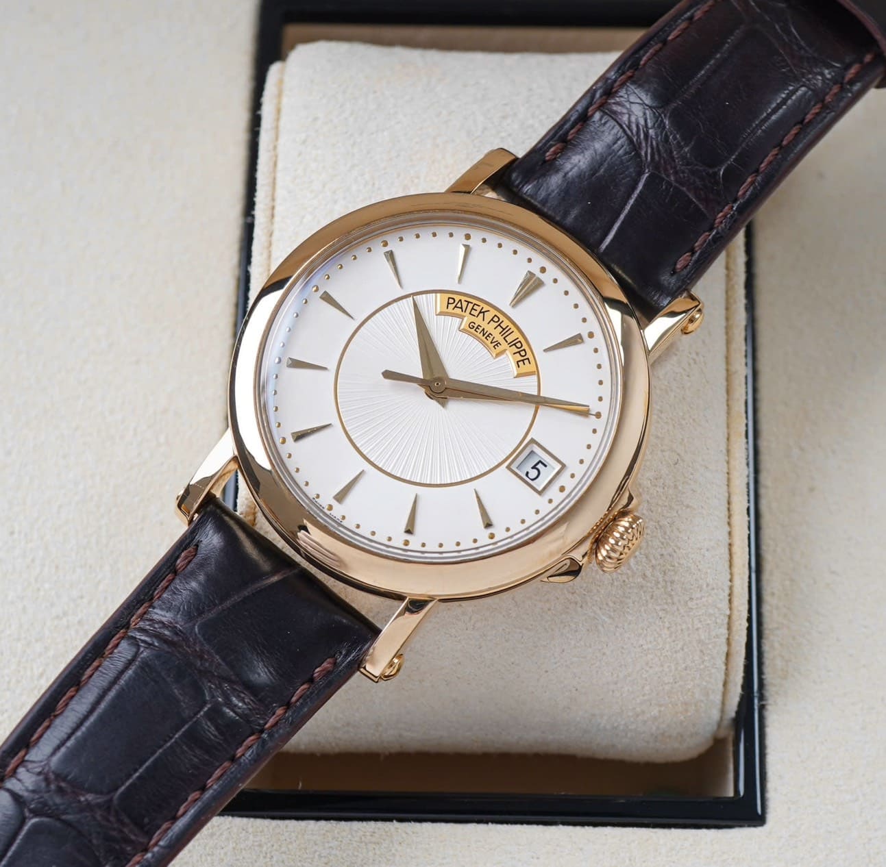 - Vỏ vàng vàng 18K 38mm dáng tròn cổ điển, thiết kế Officer’s Case với nắp lật mặt đáy, thể hiện trọn vẹn tinh thần truyền thống của Patek Philippe.