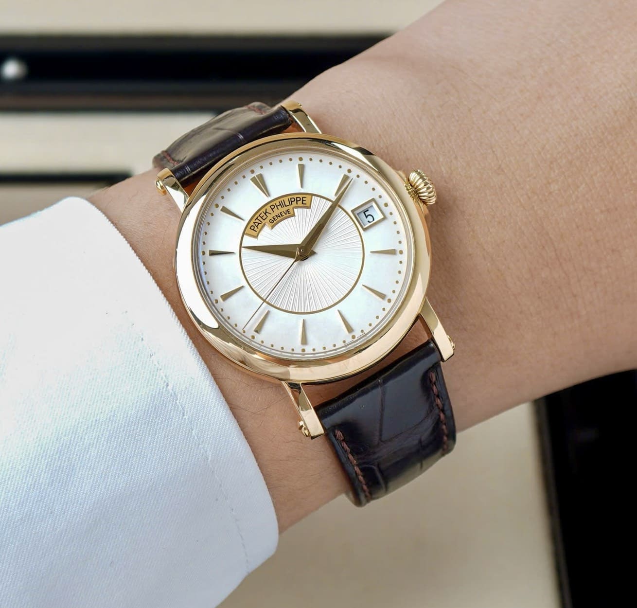 - Mặt số bạc opaline hai tầng với trung tâm guilloché thủ công, kết hợp cọc số vàng và kim dauphine thanh thoát, mang vẻ đẹp chuẩn mực của dòng Calatrava.