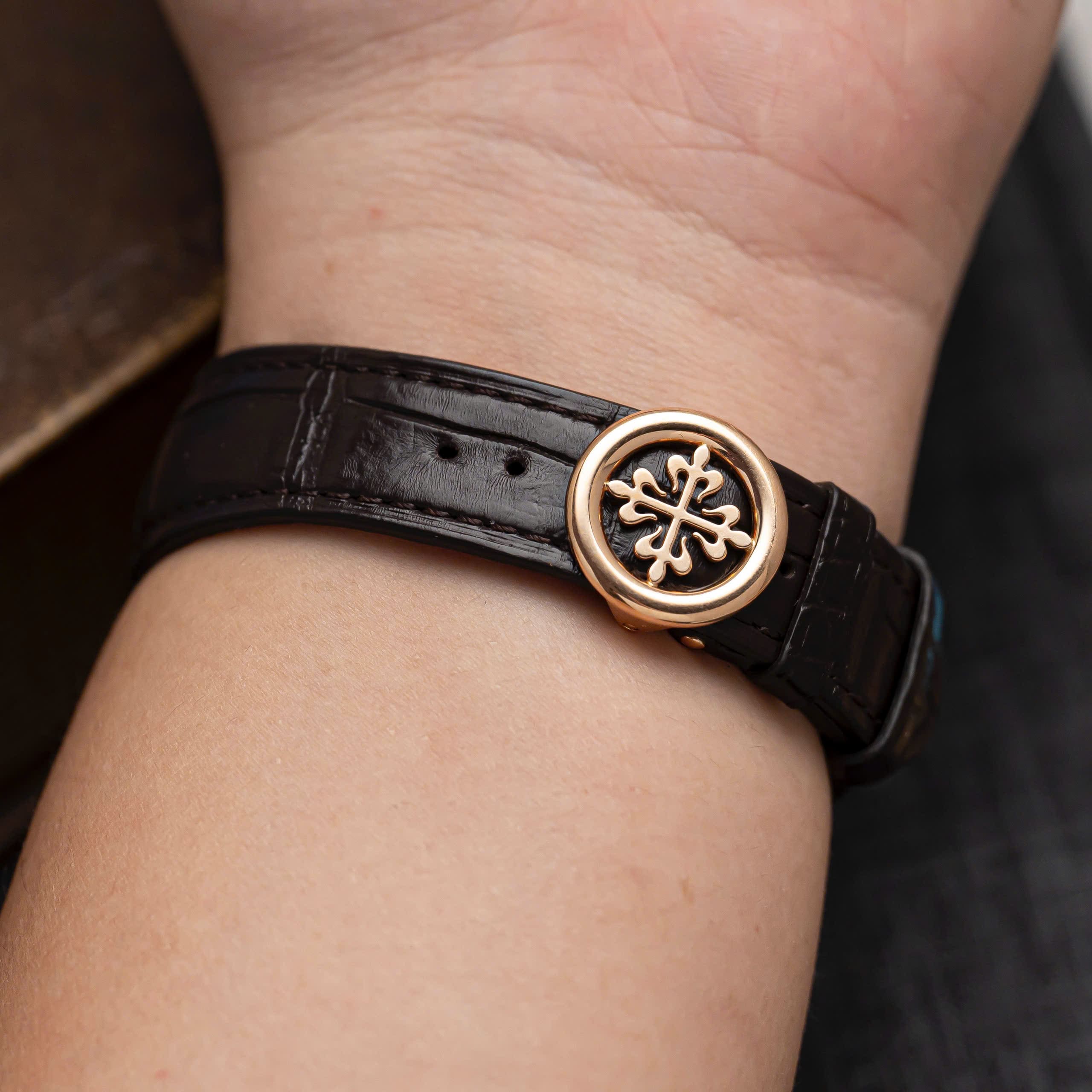 - Dây đeo: Da cá sấu nâu chocolate, khóa gập vàng hồng.