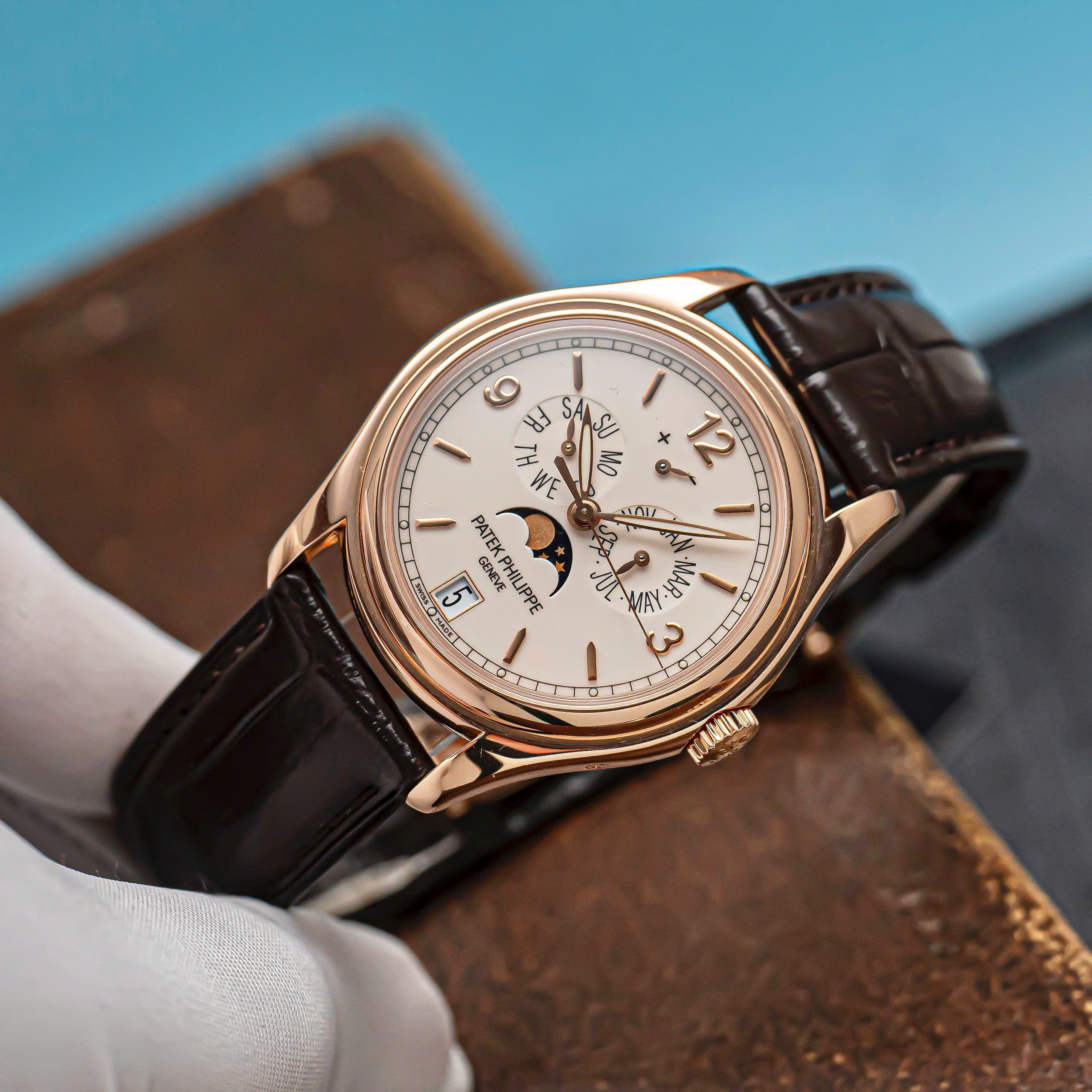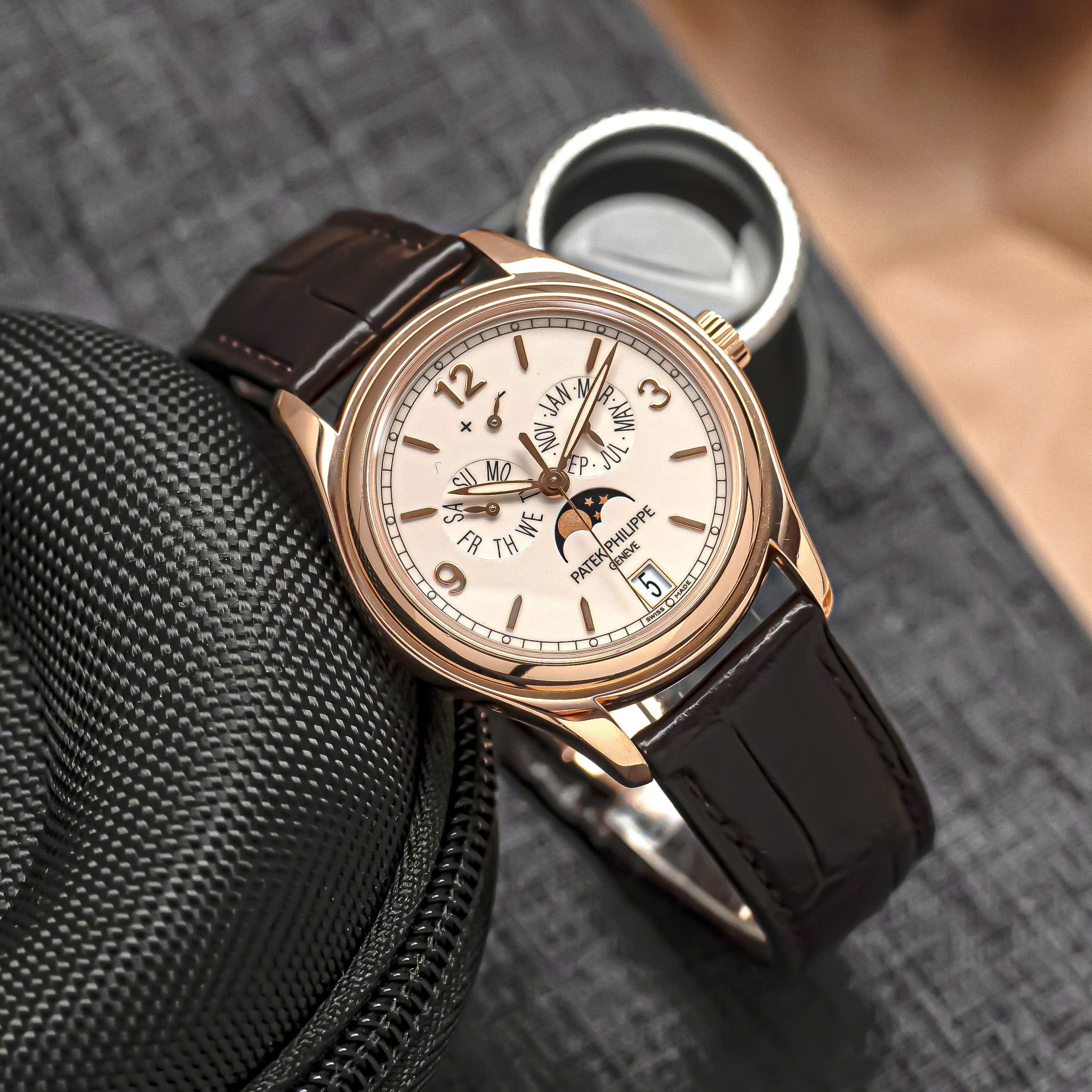 Chiếc Patek Philippe 5146R-001 là minh chứng cho sự tinh tế vượt thời gian trong nghệ thuật chế tác đồng hồ Geneva. Lớp vỏ vàng hồng tỏa sáng ấm áp ôm lấy mặt số màu kem thanh lịch, nơi các cửa sổ lịch được sắp xếp hài hòa: tháng ở hướng 12 giờ, thứ ở 9 giờ, chu kỳ trăng và lịch ngày ở 6 giờ, cùng thang dự trữ năng lượng ở 10 giờ. Mọi chi tiết được hoàn thiện thủ công với độ chính xác tuyệt đối, tạo nên một tác phẩm biểu trưng cho đẳng cấp và sự tinh tế của quý ông thành đạt.