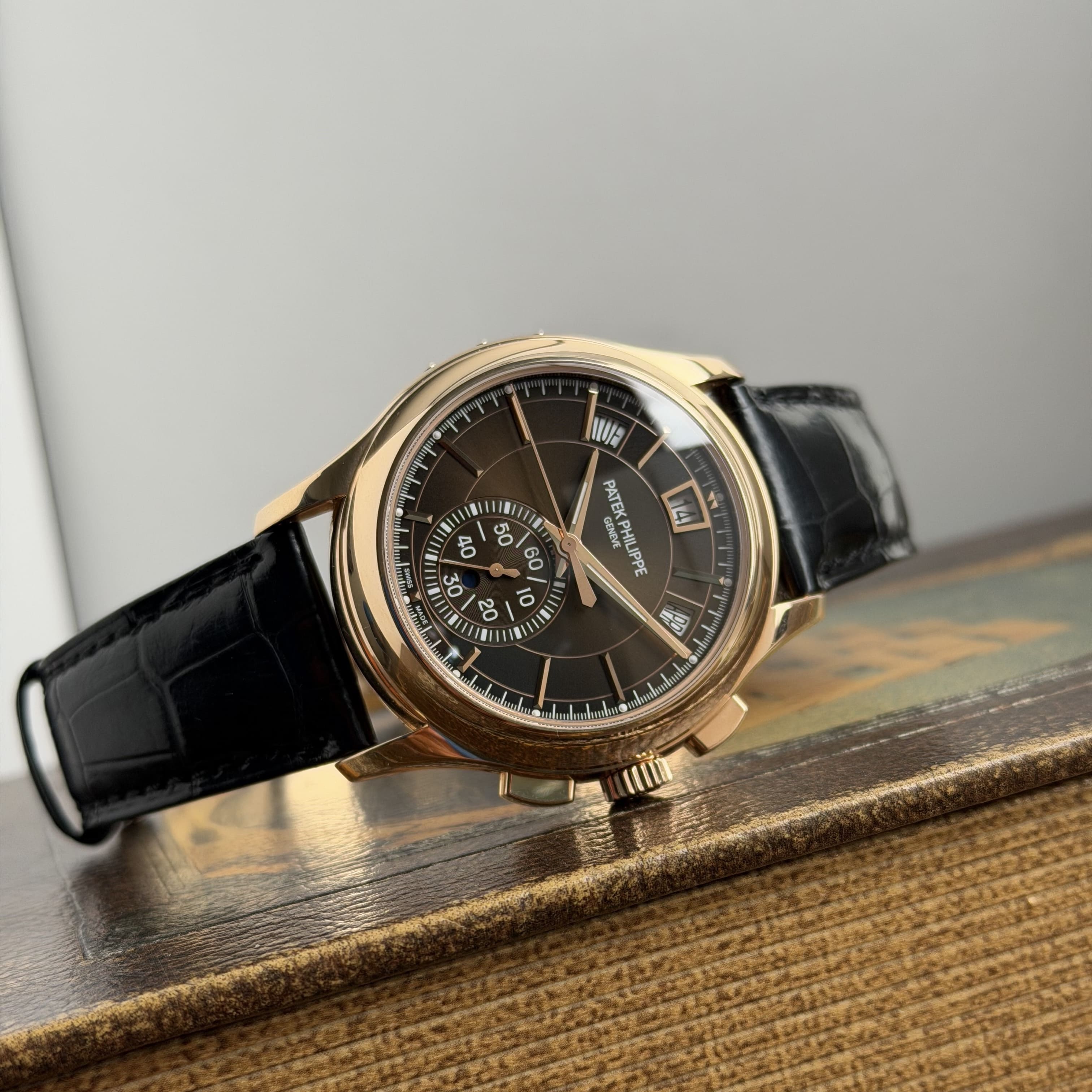 Mặt số nâu sunburst trên 5905R không chỉ hiếm mà còn mang lại cảm giác rất “chín”. Dưới ánh sáng, sắc nâu chuyển từ trầm ấm sang ánh đồng, tạo nên hiệu ứng thị giác cực kỳ cuốn hút. Khi kết hợp cùng vỏ vàng hồng, tổng thể chiếc đồng hồ toát lên một khí chất trưởng thành, đĩnh đạc – đúng với tệp khách hàng của Patek.