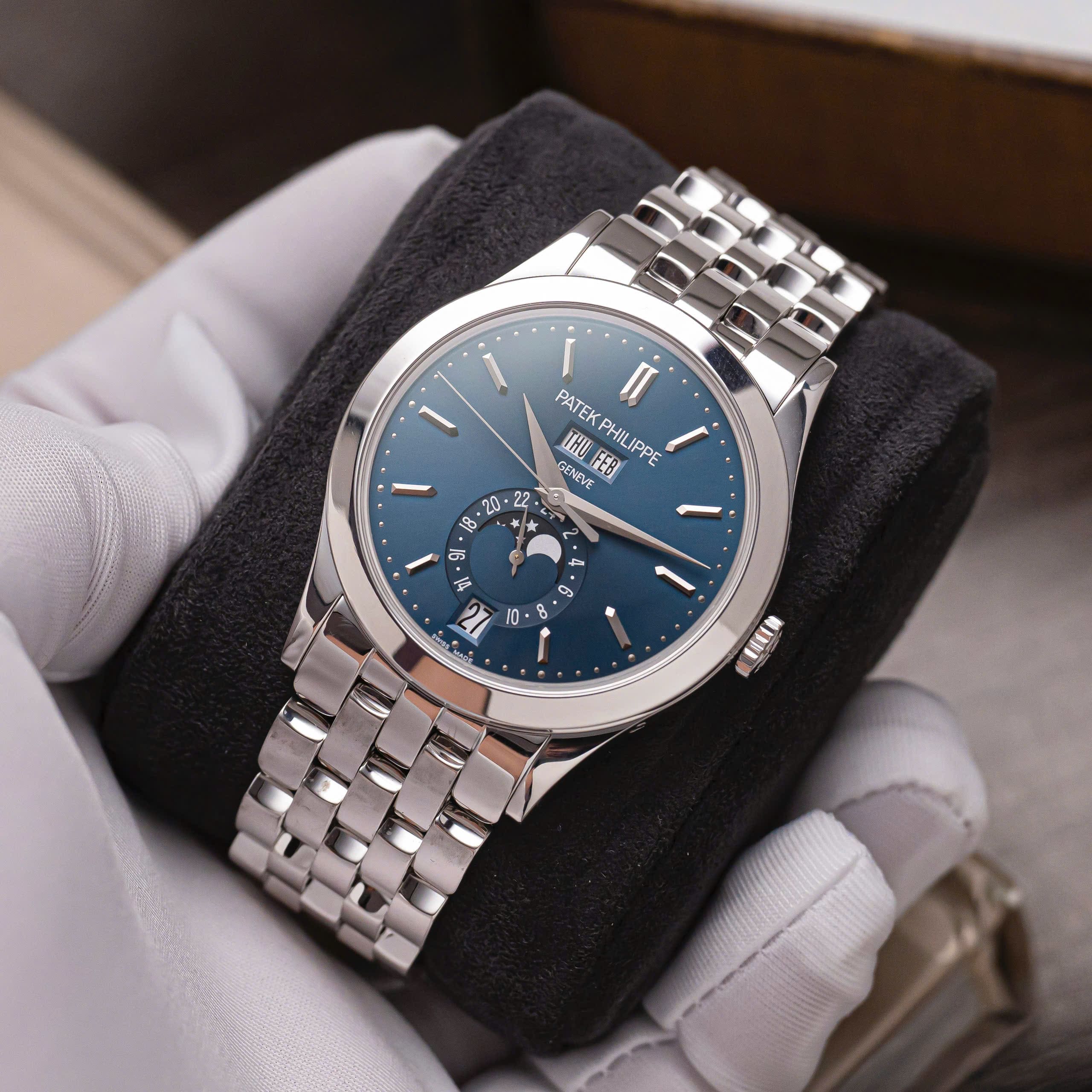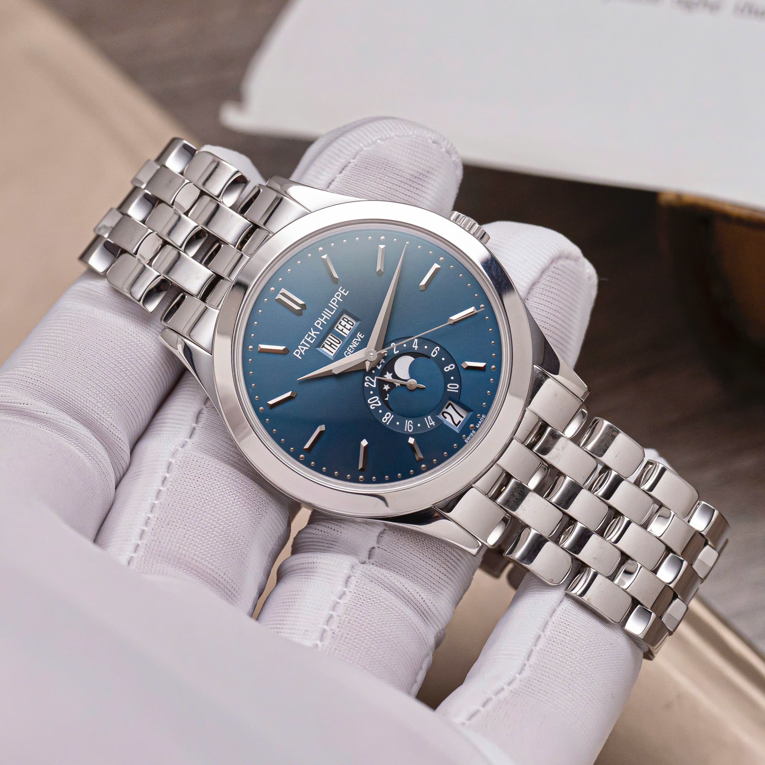 Mẫu 5396/1G-001 mang vẻ đẹp thanh lịch đặc trưng của Patek Philippe, với vỏ và dây đeo chế tác hoàn toàn từ vàng trắng 18K, tạo nên vẻ ngoài liền lạc và trang nhã. Mặt số xanh navy trơn mịn mang lại chiều sâu thẩm mỹ thuần khiết và tinh tế.