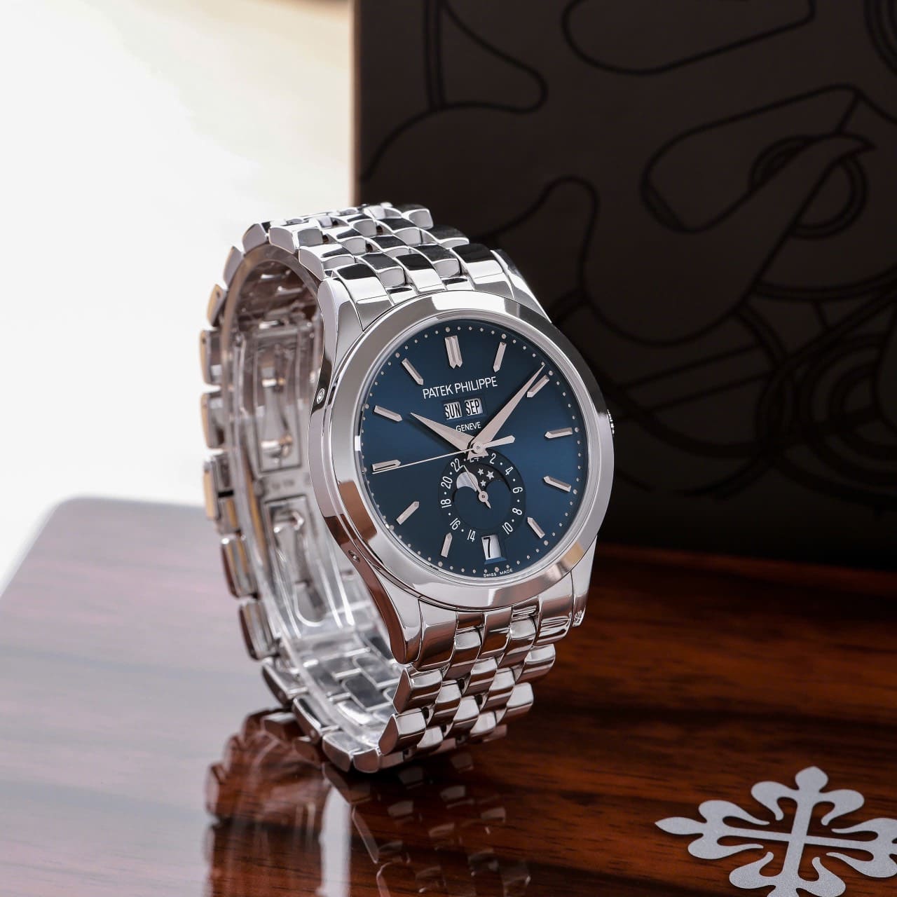 Chiếc Patek Philippe 5396/1G-001 là biểu tượng của phong cách cổ điển pha hiện đại, thể hiện sự tinh tế trong từng chi tiết. Mặt số xanh navy kết hợp hoàn hảo cùng bộ kim Dauphine và cọc số vàng trắng tạo nên chiều sâu thị giác lôi cuốn. Bố cục hiển thị thứ – tháng ở vị trí 12 giờ, cùng lịch trăng và kim 24 giờ ở 6 giờ mang đến sự cân đối và đậm chất Haute Horlogerie. Đây là mẫu đồng hồ lý tưởng cho quý ông yêu thích sự thanh lịch, chuẩn xác và đẳng cấp trong từng nhịp chuyển động.