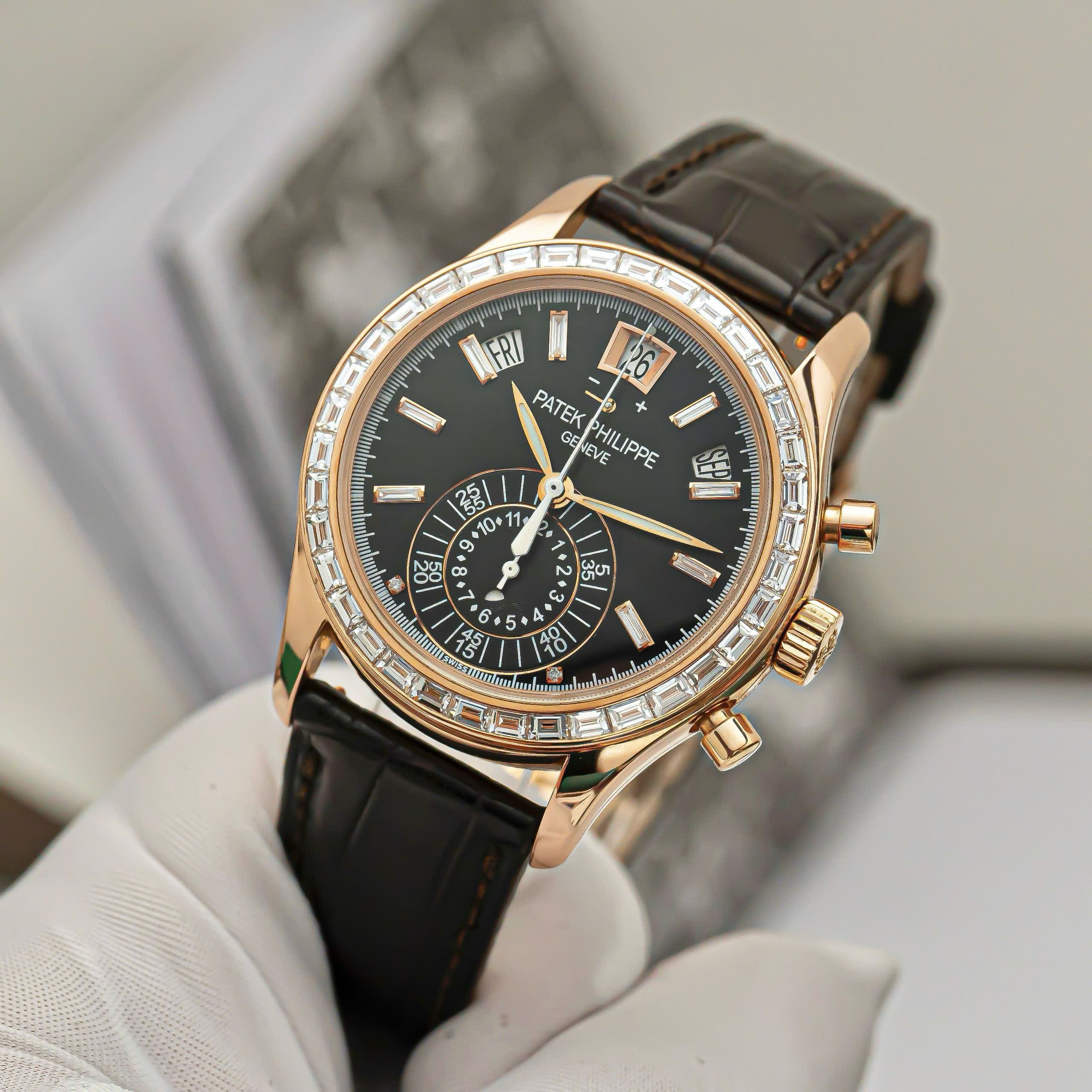 - Mặt số đen tuyền đầy quyền lực, bố cục lịch thường niên và chronograph cân đối, biểu tượng của kỹ nghệ cơ học Patek Philippe.