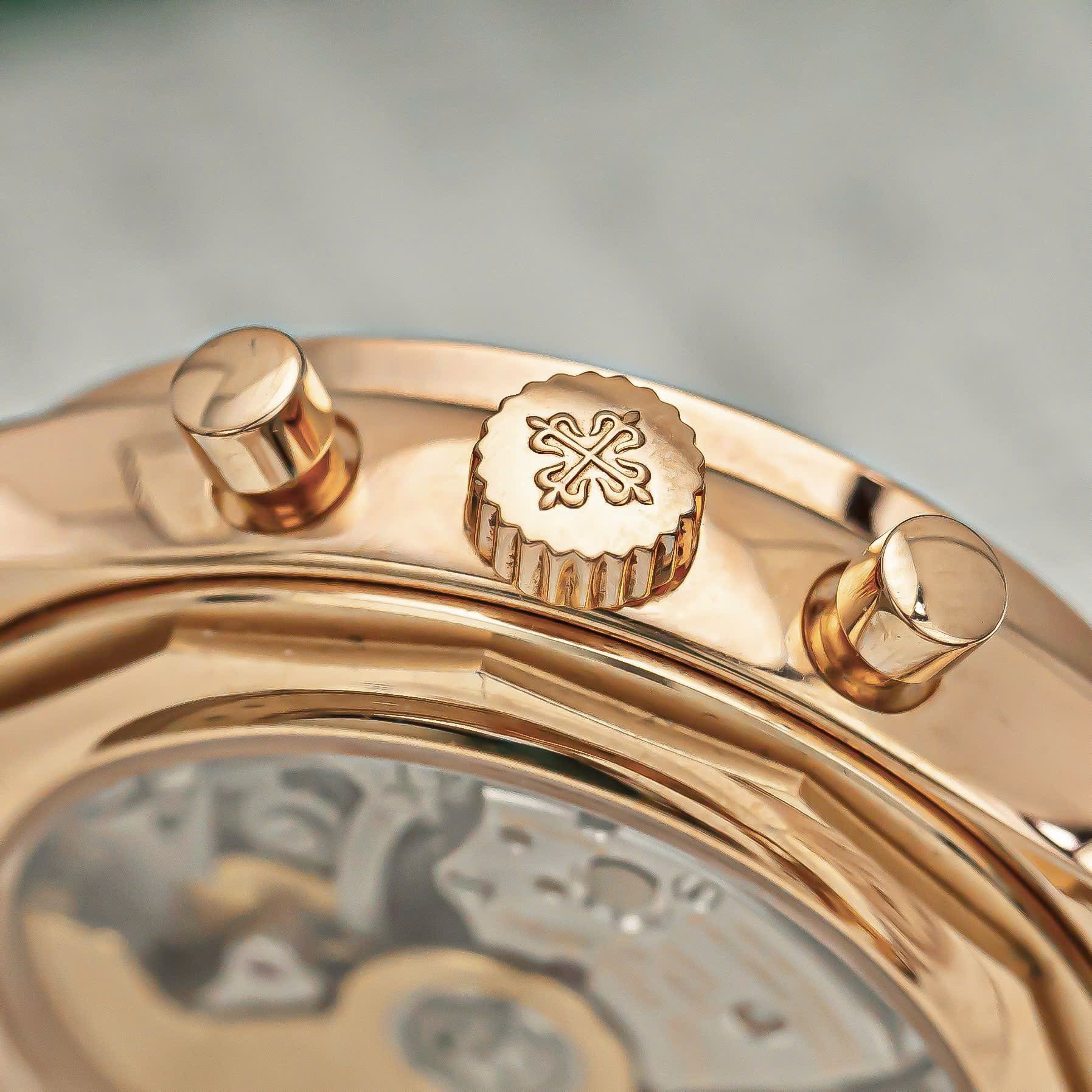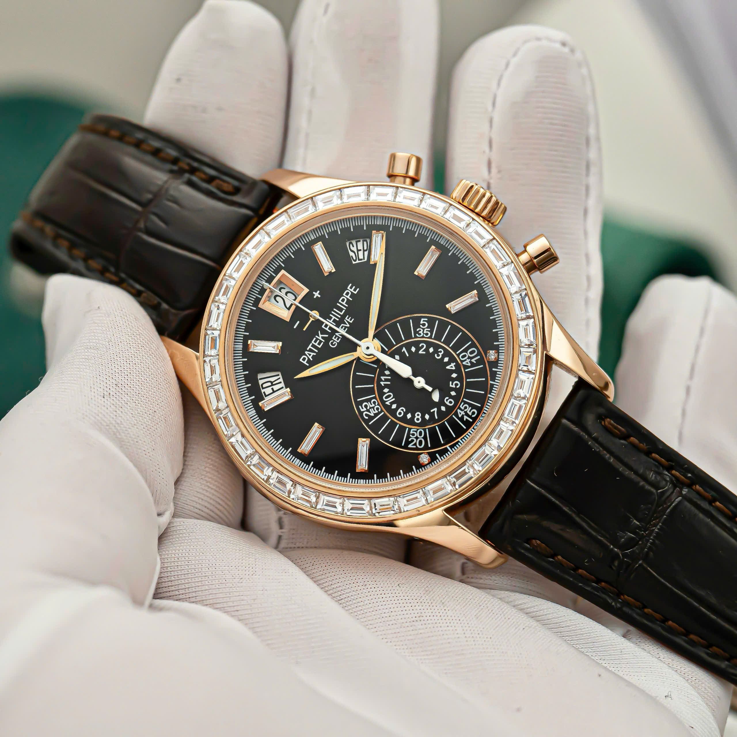Trên nền mặt số đen sâu, các chi tiết vàng hồng nổi bật tạo nên độ tương phản cuốn hút, trong khi các ô hiển thị lịch thứ, ngày, tháng và thang chronograph được bố trí cân đối hoàn hảo. Bên trong, bộ máy Calibre CH 28-520 IRM QA 24H hoạt động bền bỉ, tích hợp tính năng flyback chronograph và lịch thường niên, thể hiện kỹ nghệ cơ học bậc thầy của Patek Philippe.