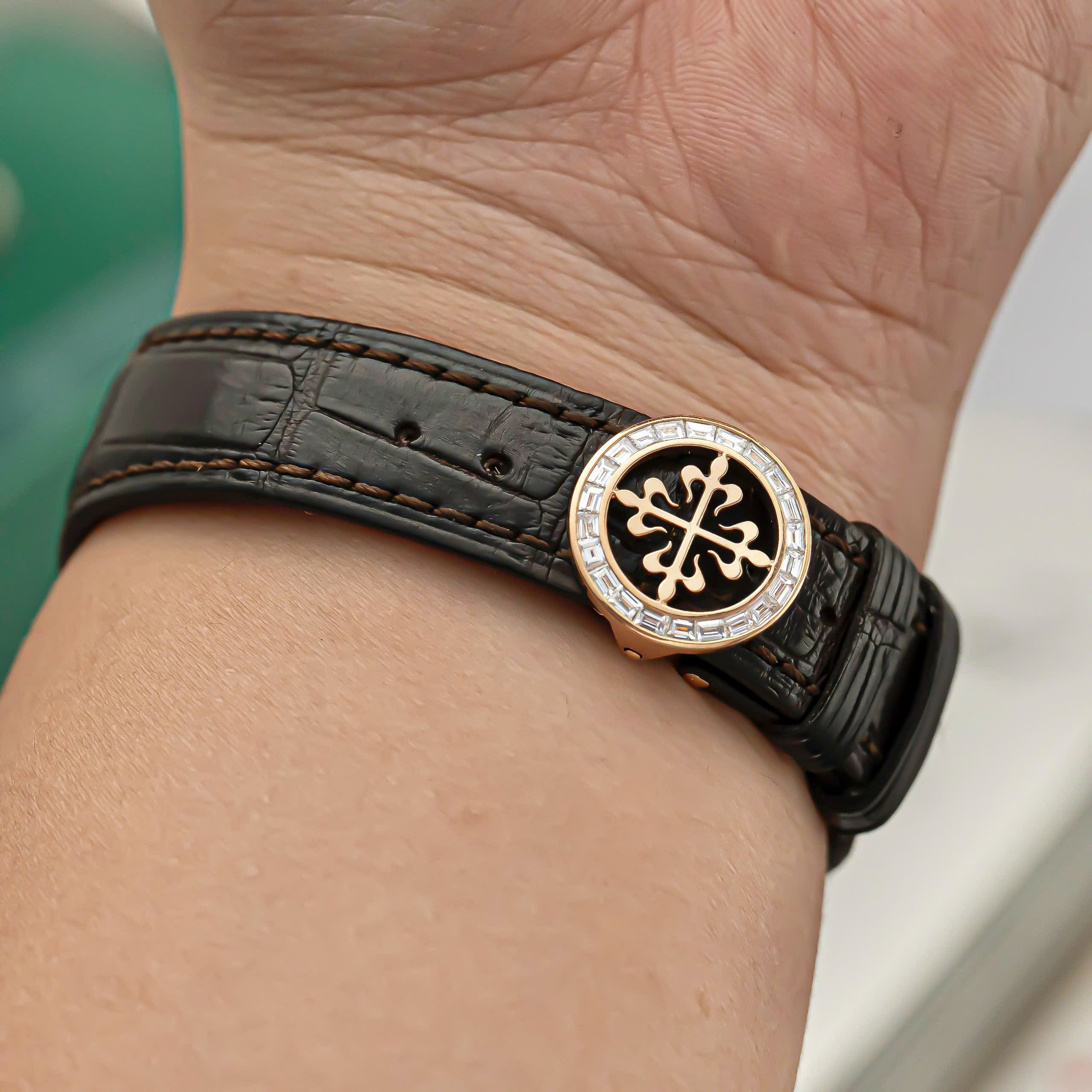 - Vỏ vàng hồng 18K kết hợp vành bezel nạm kim cương baguette thiên nhiên, nâng tầm đẳng cấp tiệm cận phiên bản 5961R.