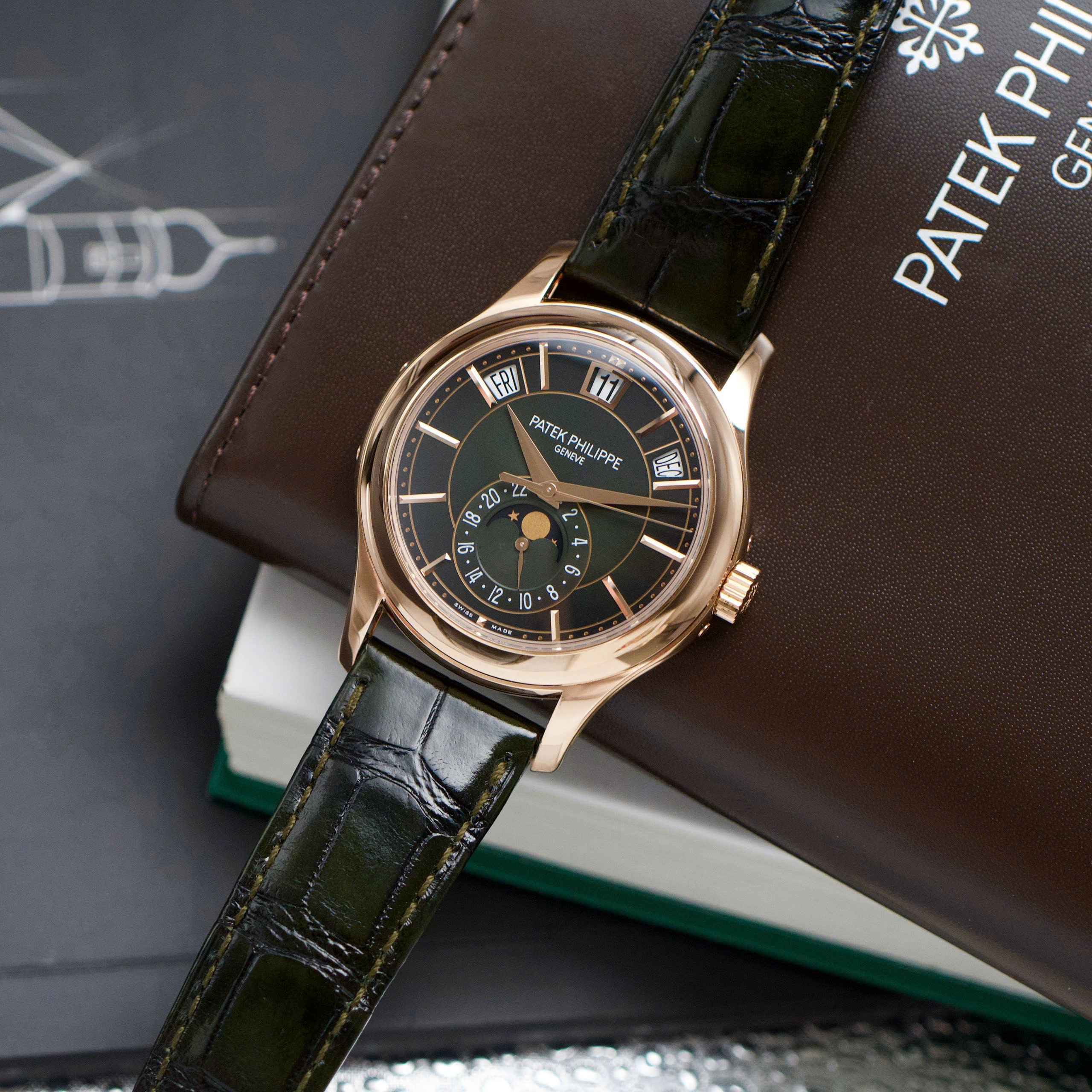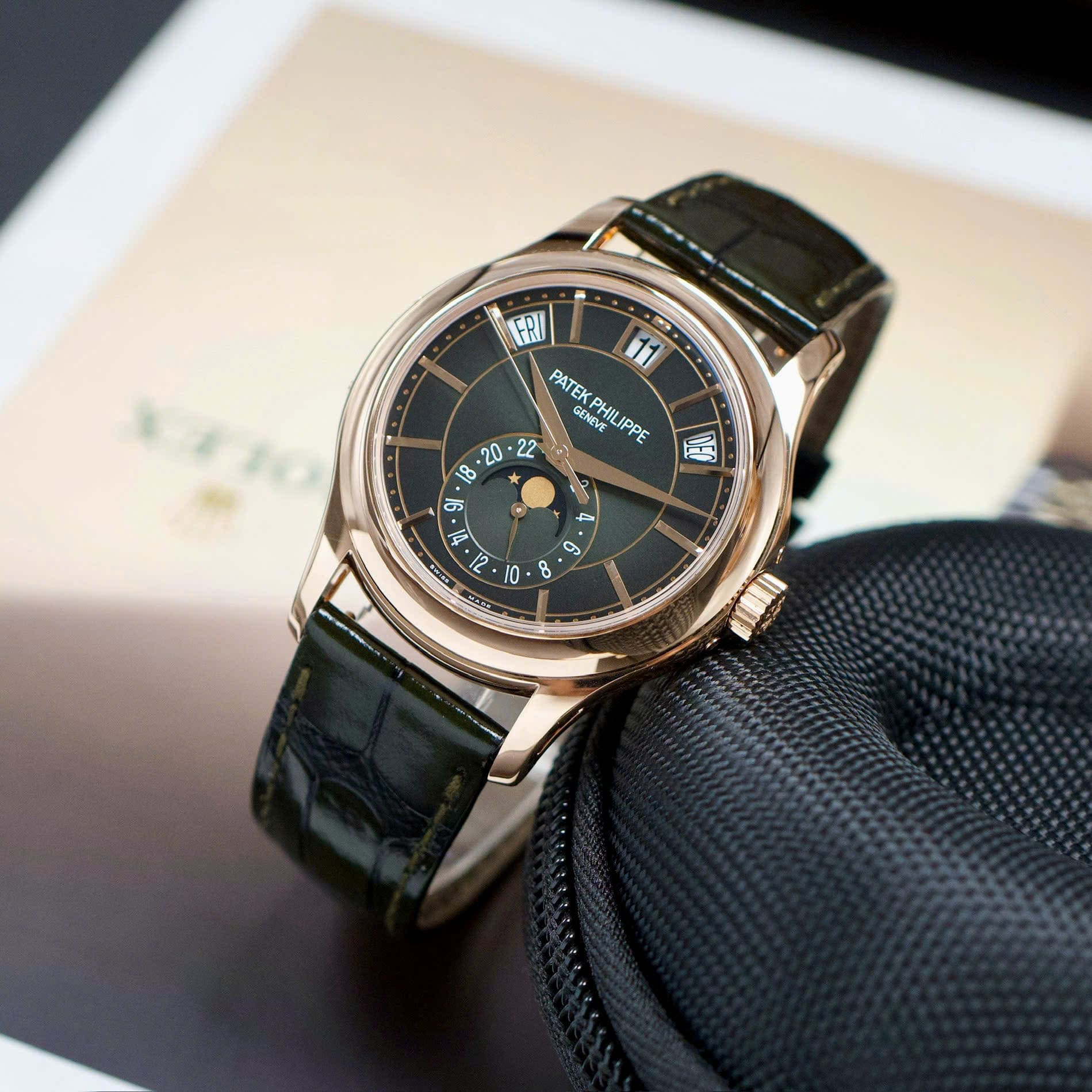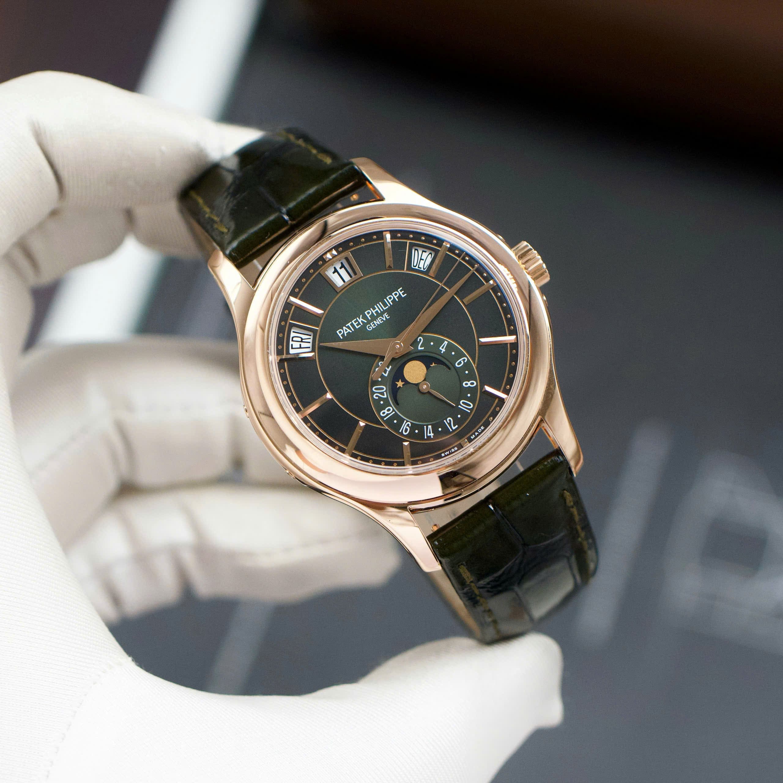 Patek Philippe 5205R-011 với vẻ ngoài đậm chất cổ điển nhưng vẫn tinh tế đến từng chi tiết, đây là sự kết tinh giữa công nghệ chế tác thượng hạng và ngôn ngữ thiết kế lịch lãm. Lớp vỏ bằng vàng hồng 18K được đánh bóng hoàn mỹ, ôm trọn mặt số xanh olive chuyển sắc, vốn được hoàn thiện chải tia tinh xảo để tạo nên hiệu ứng ánh sáng thay đổi tùy góc nhìn – một chi tiết thể hiện trình độ thủ công bậc thầy của nhà Patek.