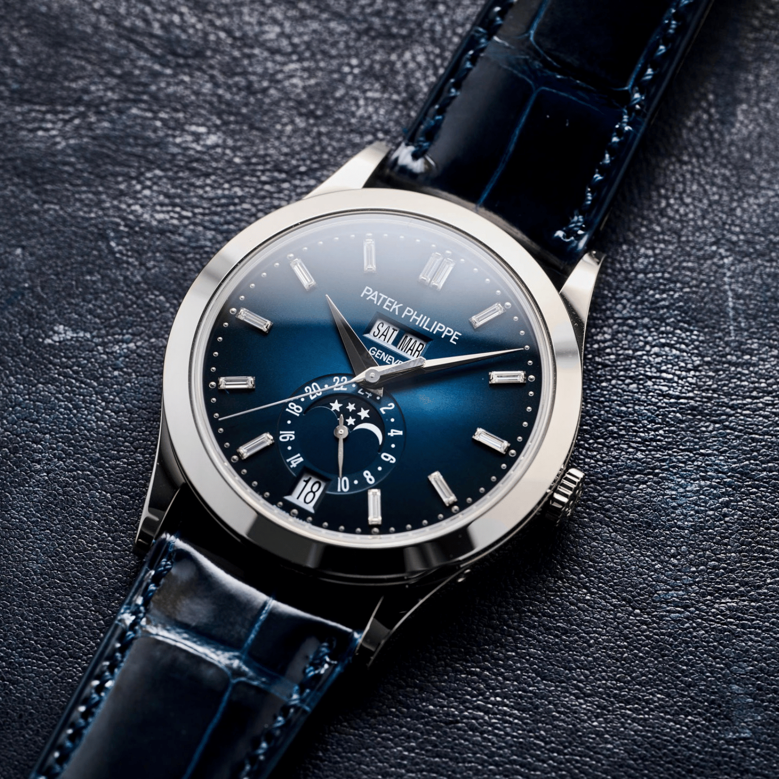 Điểm nổi bật của Ref. 5396G chính là mặt số xanh navy sunburst với hiệu ứng chải tia tinh tế. Khi ánh sáng chiếu vào, mặt số tạo ra hiệu ứng chuyển sắc rất đẹp, làm nổi bật toàn bộ bố cục hiển thị của chiếc đồng hồ.