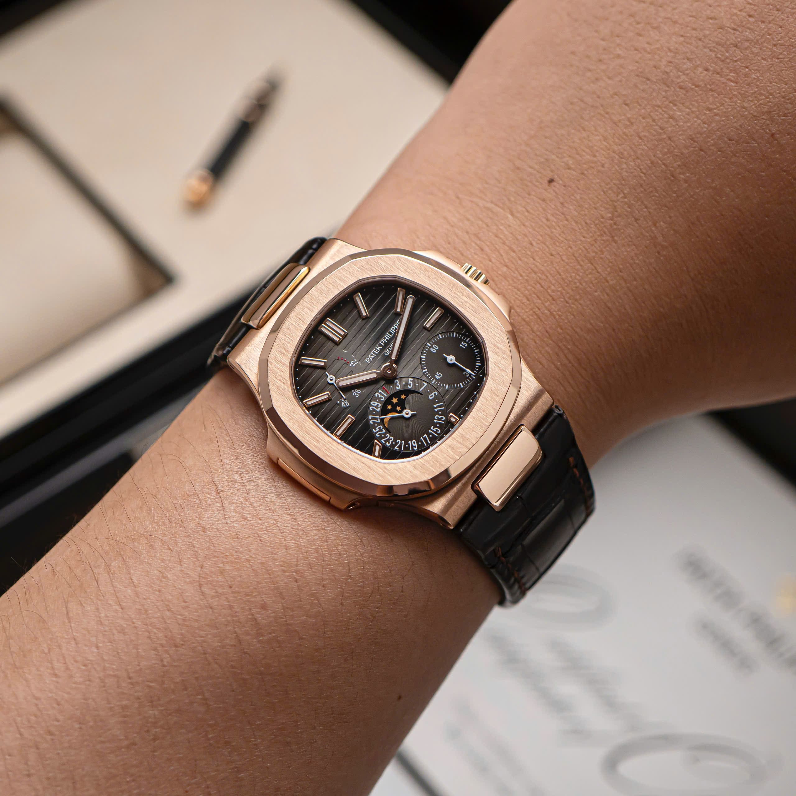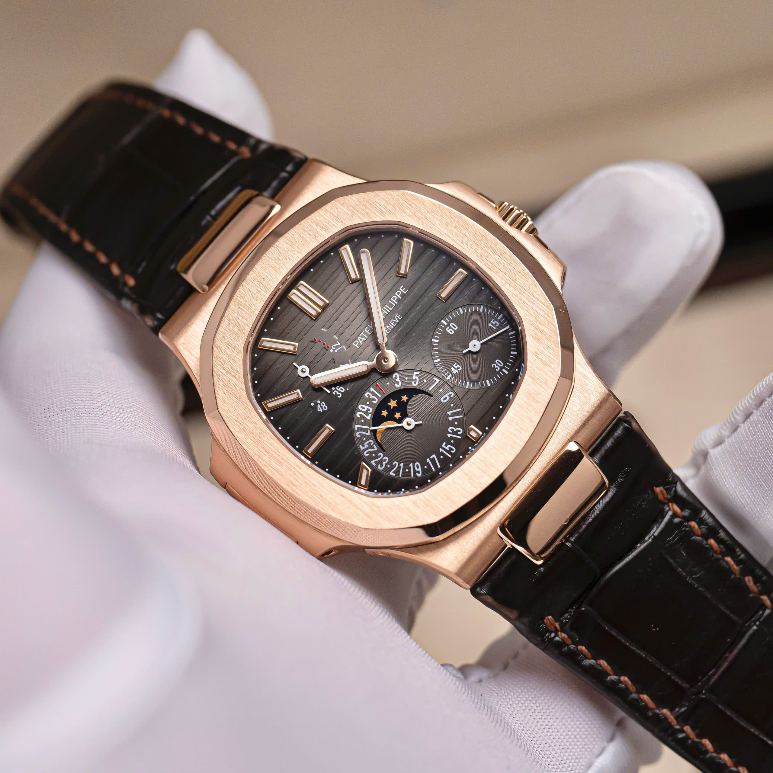 Chiếc Patek Philippe Nautilus 5712R-001 mang đến vẻ đẹp hài hòa giữa sự sang trọng và kỹ thuật chế tác tinh xảo. Bộ vỏ vàng hồng 18K kết hợp cùng mặt số nâu chocolate với họa tiết sóng ngang mang đậm dấu ấn Nautilus, tôn vinh phong cách thanh lịch vượt thời gian. Bố cục mặt số phi đối xứng tinh tế thể hiện các chức năng cao cấp như chỉ báo dự trữ năng lượng, lịch ngày bằng kim, lịch tuần trăng và kim giây nhỏ – tất cả đều được vận hành bởi bộ máy cơ tự động Caliber 240 PS IRM C LU, nổi tiếng với độ mỏng và độ hoàn thiện thủ công tinh vi. Hoàn thiện với dây da cá sấu nâu và khóa gập vàng hồng, 5712R-001 không chỉ là biểu tượng của Haute Horlogerie mà còn là minh chứng cho gu thẩm mỹ đỉnh cao của người sở hữu.