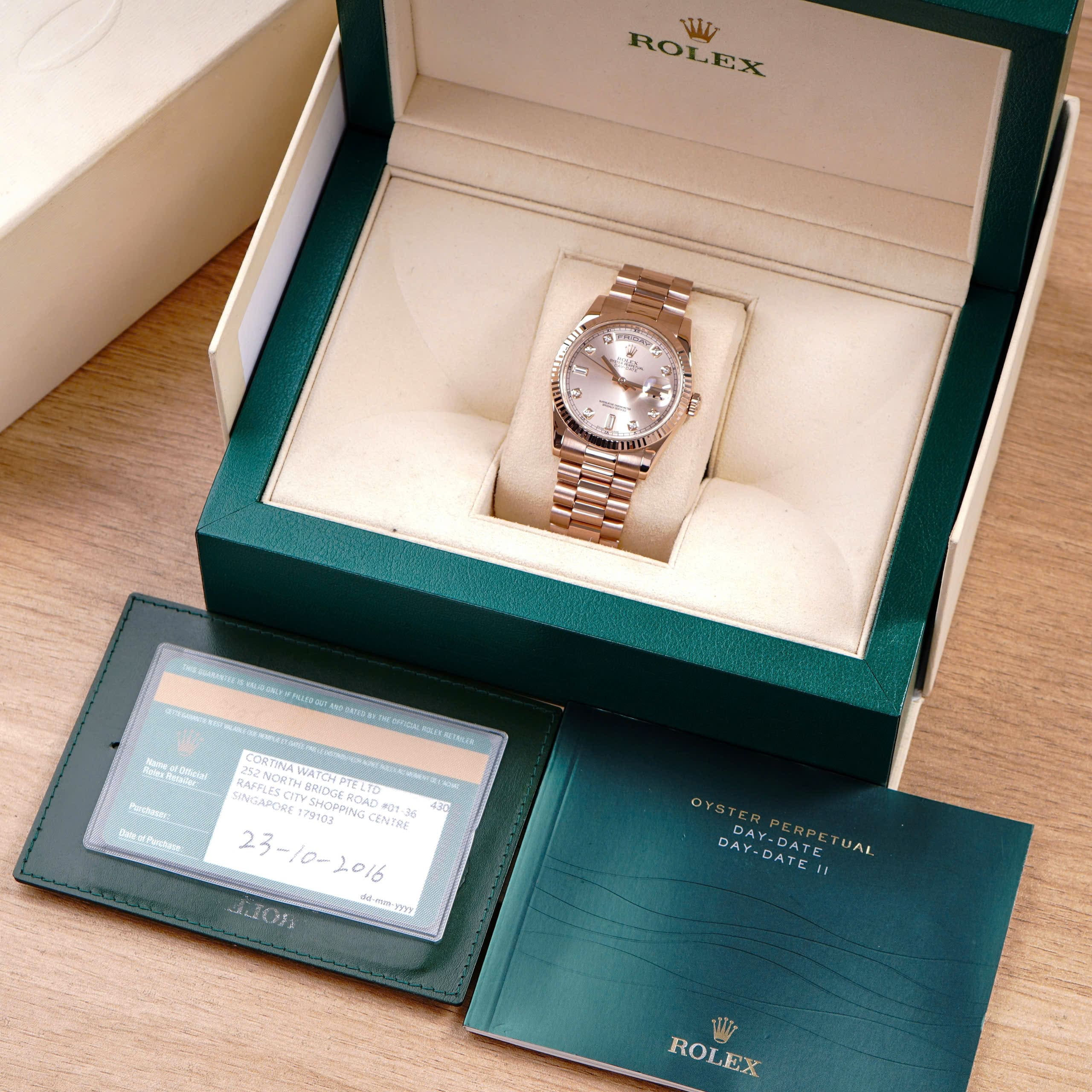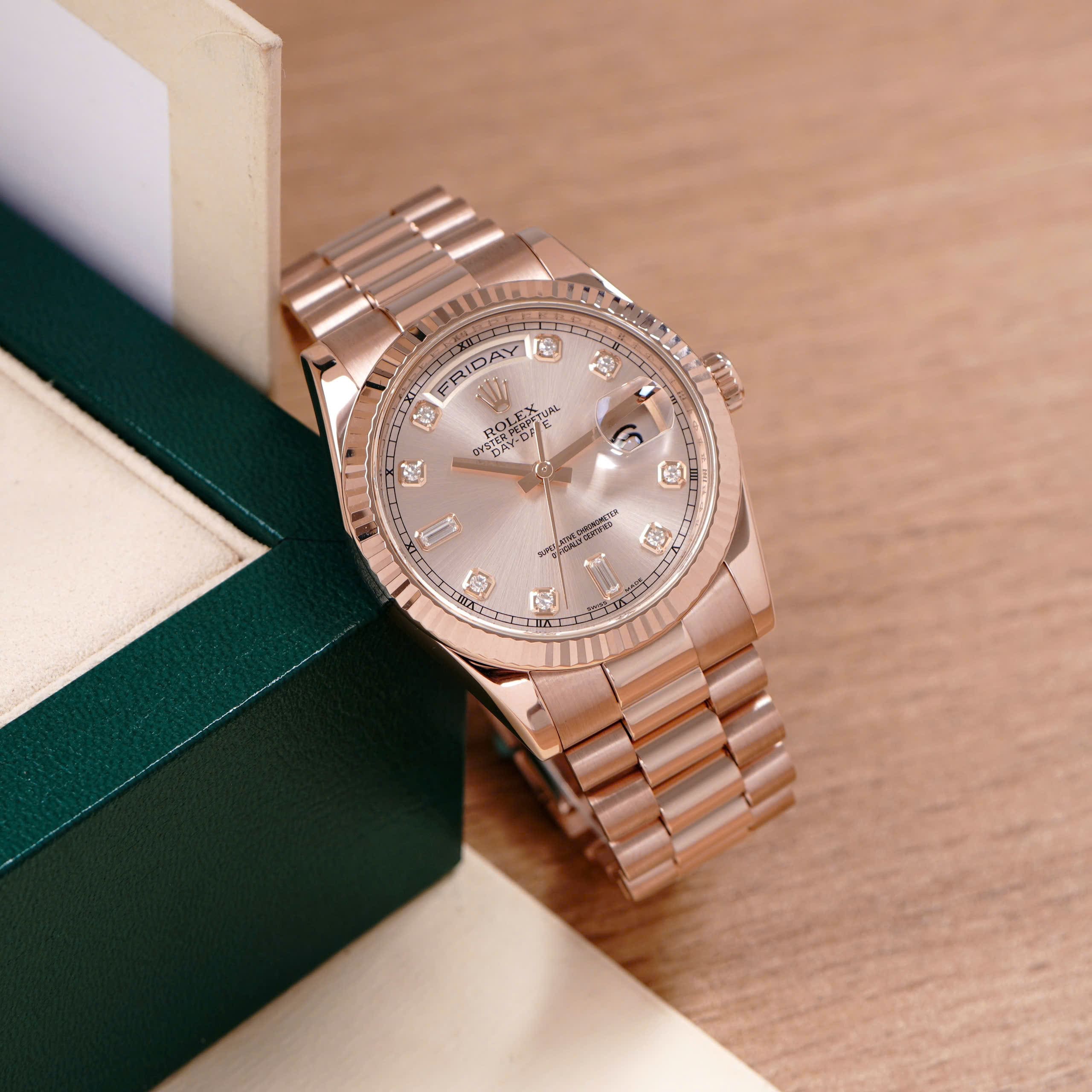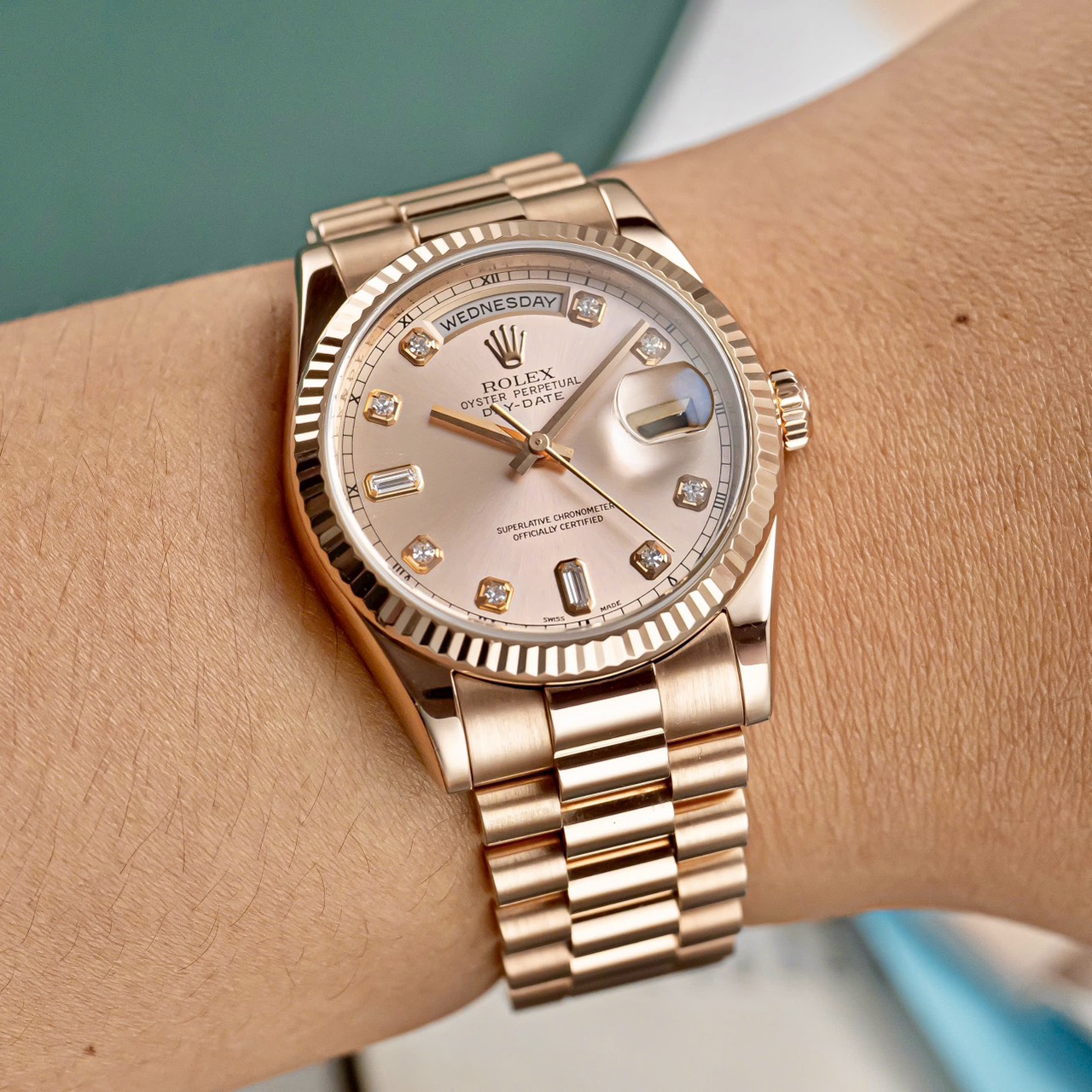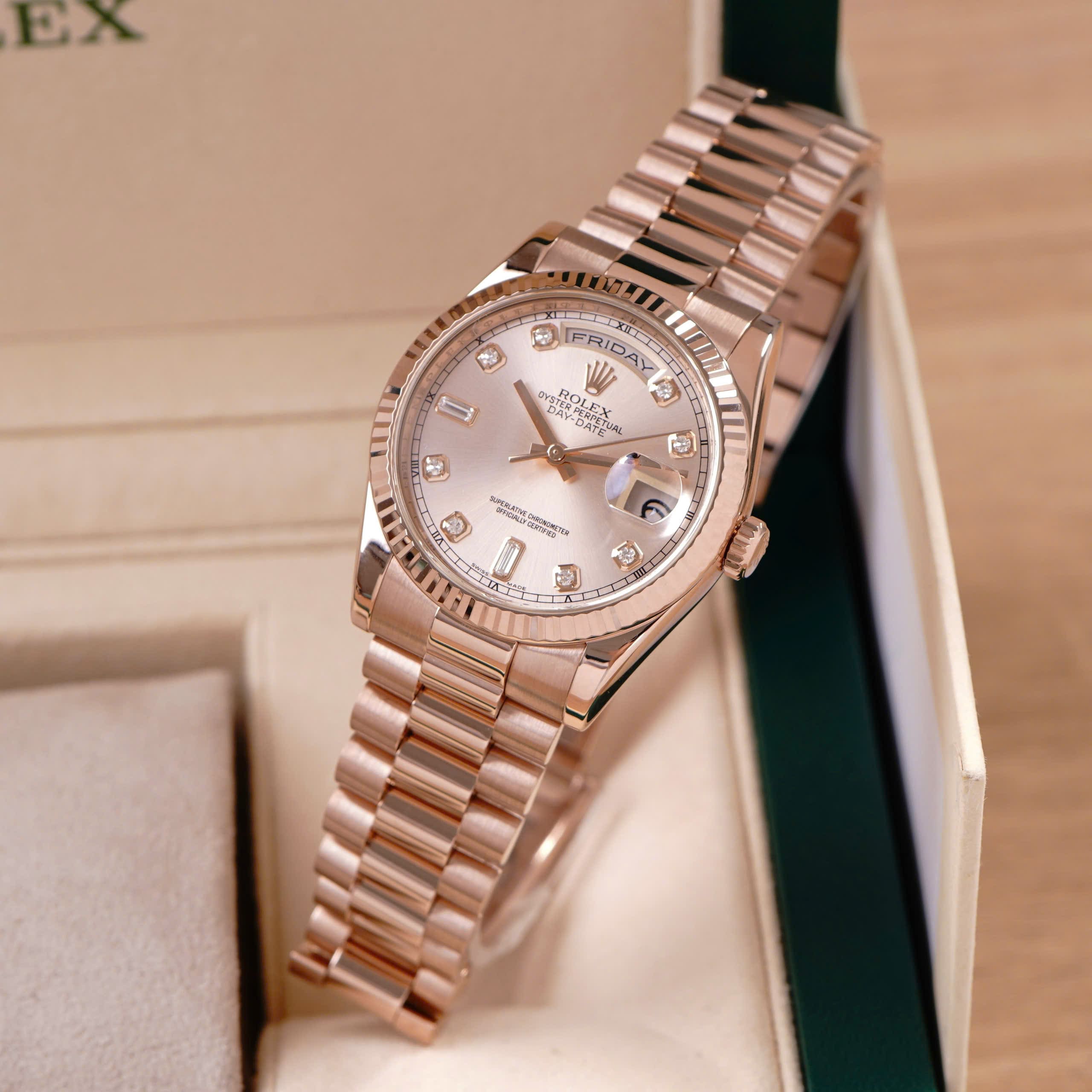 - Thiết kế vỏ và dây President vàng hồng 18K độc quyền của Rolex, tỏa sắc ấm áp và thanh lịch đặc trưng.