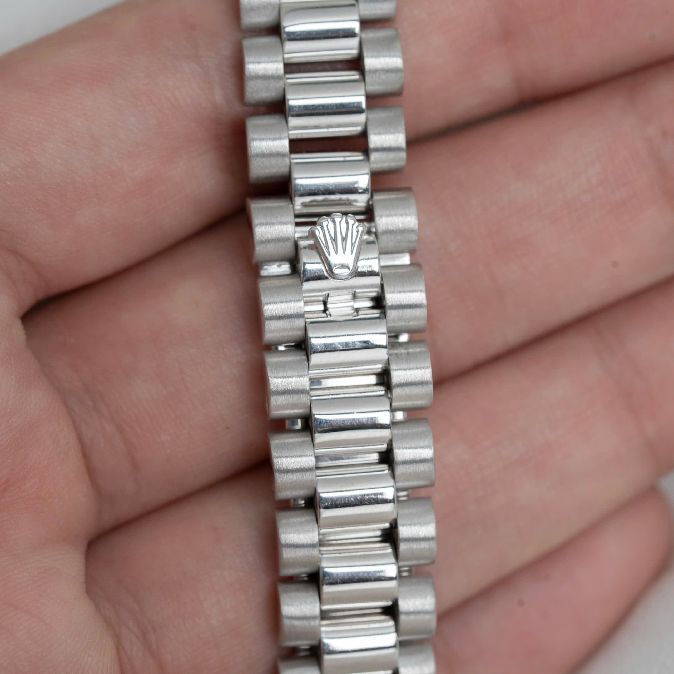 – Dây President vàng trắng 18k, mềm mại, đeo cực kỳ thoải mái và tôn cổ tay.