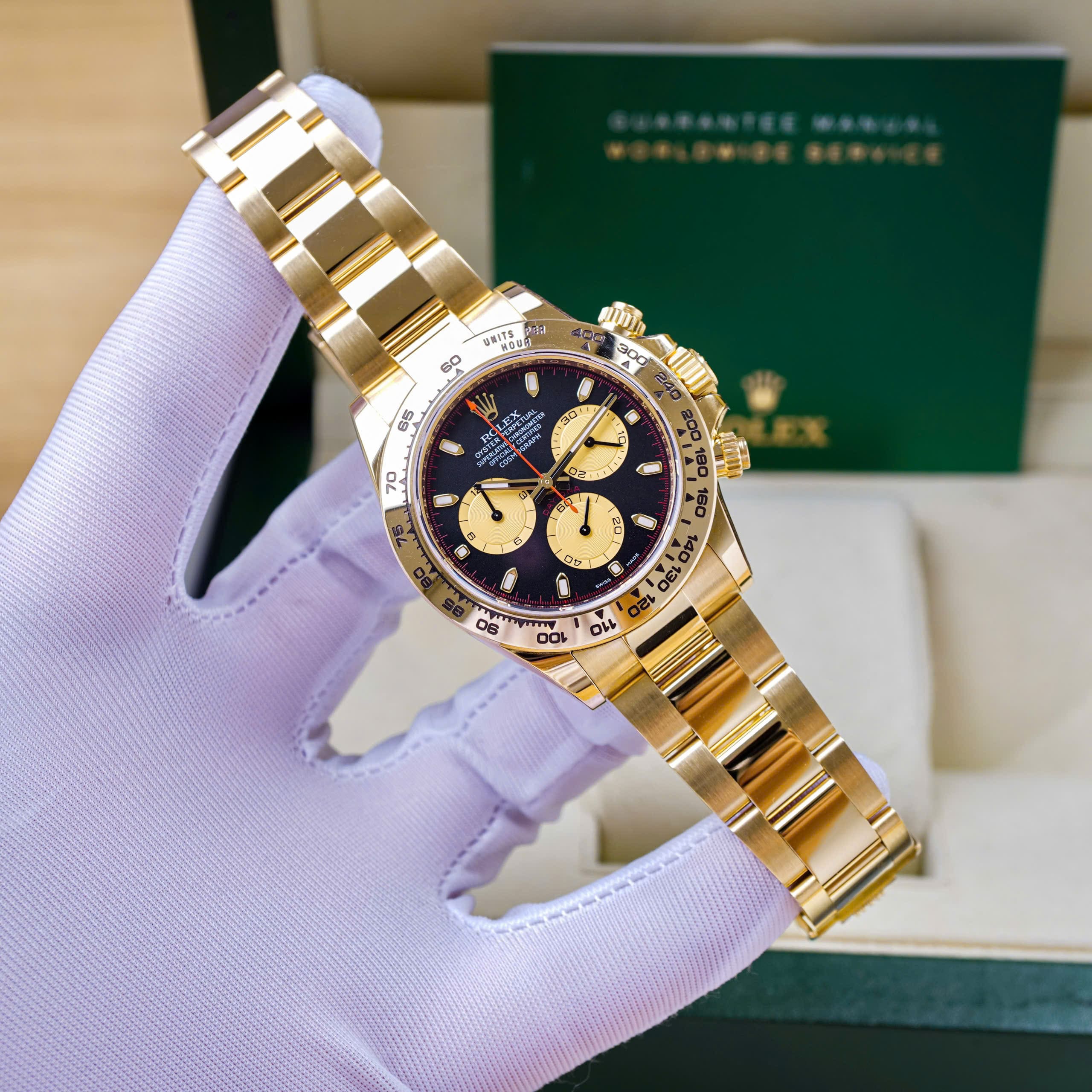 – Vỏ 40mm vàng vàng 18K, hoàn thiện chải – bóng cao cấp, kết hợp bezel tachymeter khắc nổi đặc trưng Daytona.