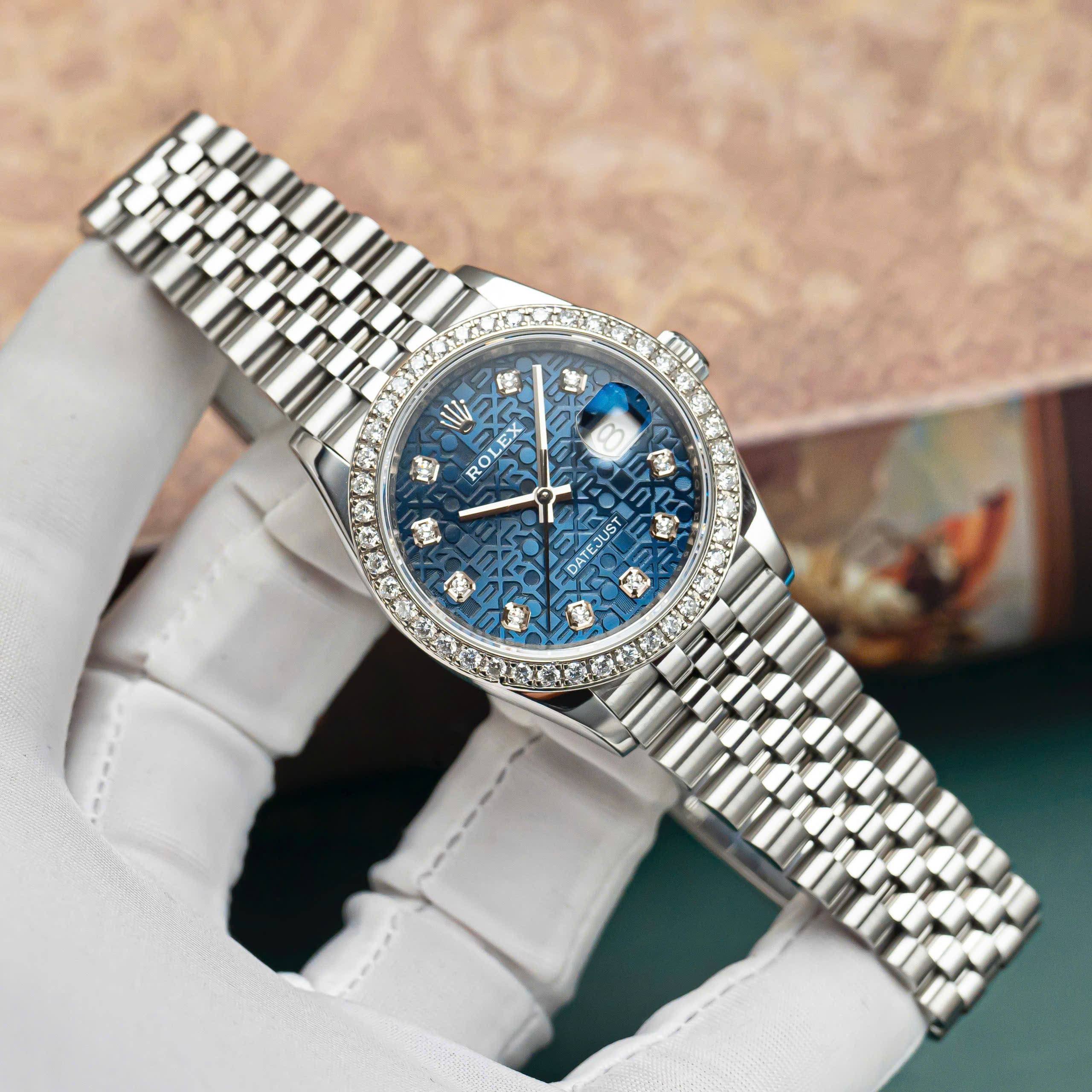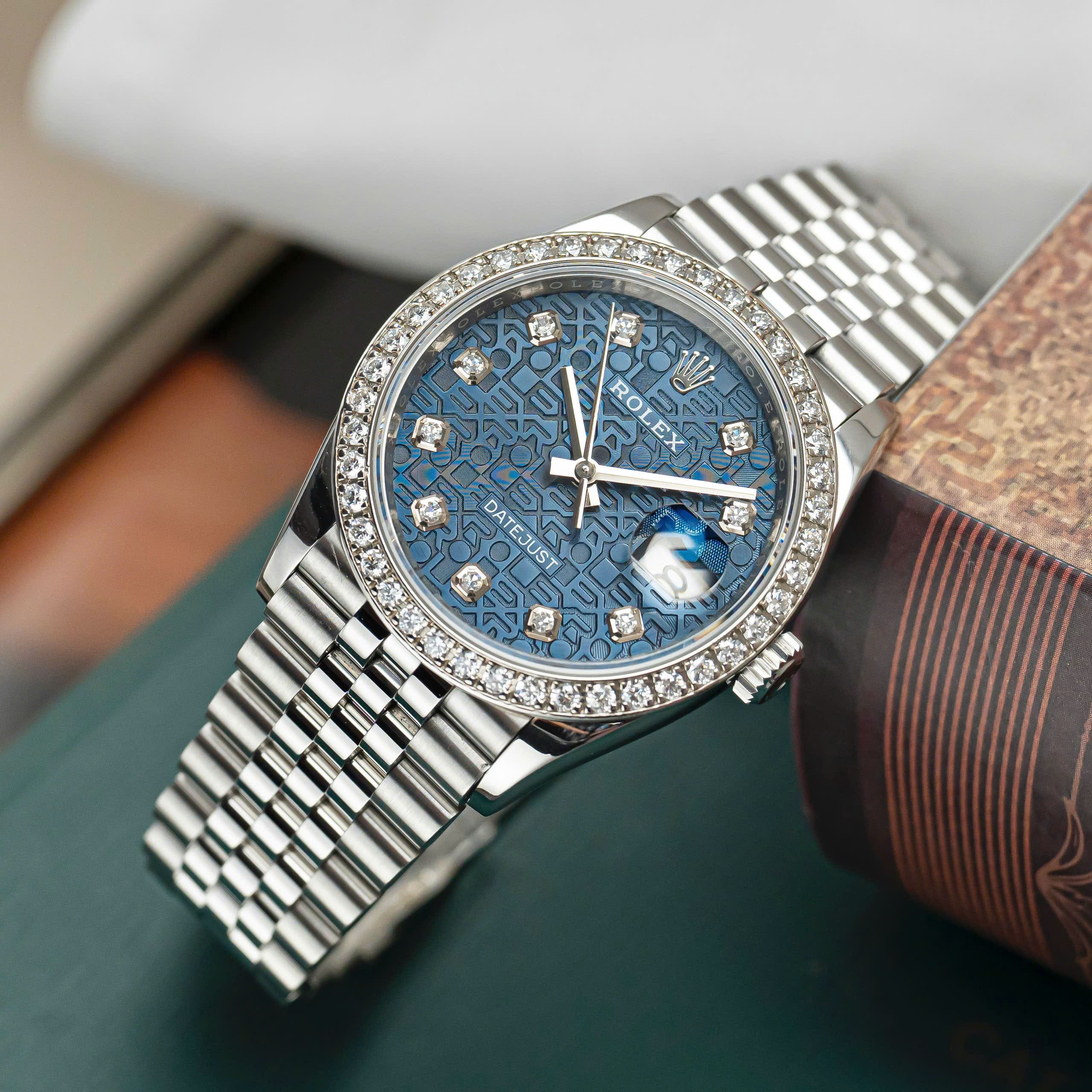 Điểm nhấn ấn tượng nhất nằm ở mặt số xanh dương khắc nổi họa tiết chữ “ROLEX”, mang đến chiều sâu thị giác và cá tính riêng biệt. Trên nền đó, cọc số kim cương tinh khiết được đính công phu, phản chiếu ánh sáng tinh tế dưới từng chuyển động cổ tay.