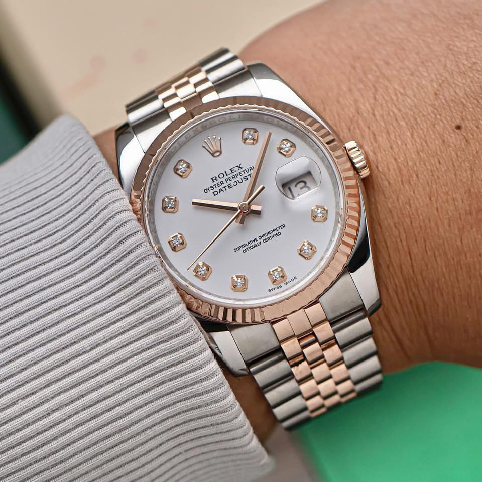 Ref. 116231 sử dụng cấu trúc Rolesor Everose – phối hợp giữa thép Oystersteel bền bỉ và vàng hồng Everose 18K. Bezel khía vàng Everose không chỉ tạo hiệu ứng bắt sáng đặc trưng mà còn là chi tiết “DNA” giúp Datejust luôn sang trọng mà không cần phô trương. Kích thước 36mm giữ tỷ lệ cổ điển, đeo gọn gàng và chuẩn dress-watch.