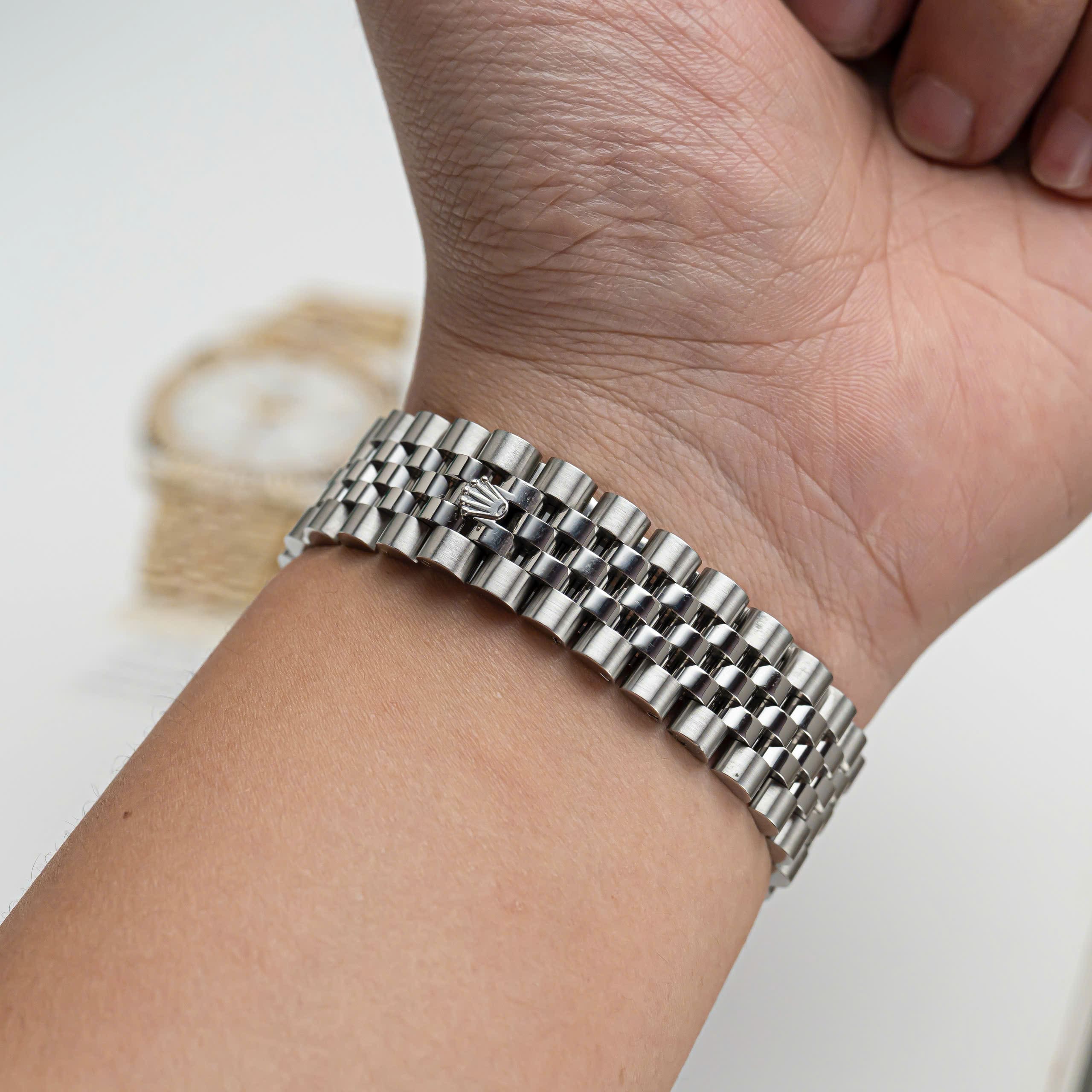 Bên trong là bộ máy Calibre 3135 cơ tự động, đạt chuẩn Superlative Chronometer với độ chính xác cao và khả năng trữ cót khoảng 48 giờ. Dây Jubilee 5 mối nối cùng khóa ẩn Crownclasp mang lại cảm giác đeo mềm mại và liền mạch trên cổ tay.