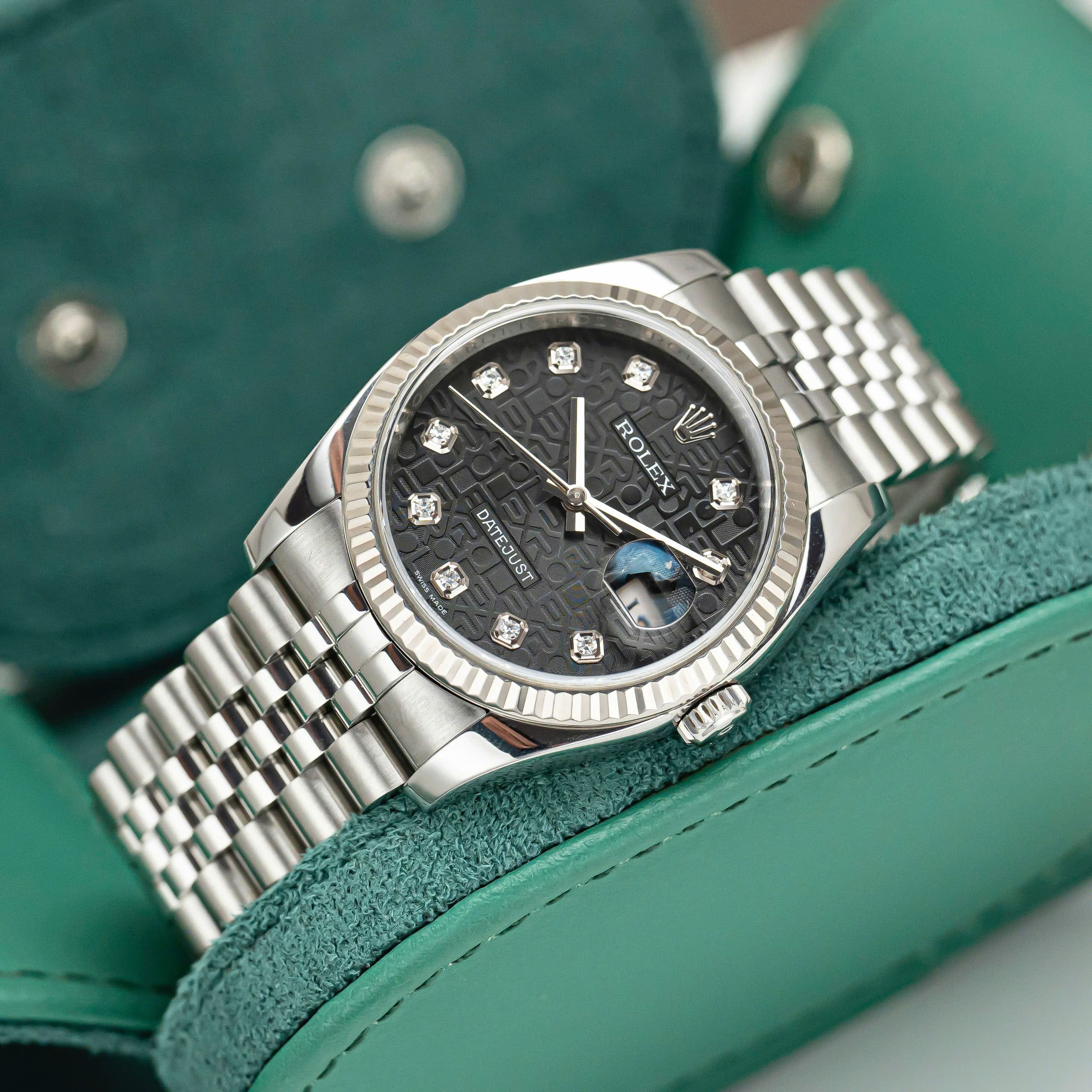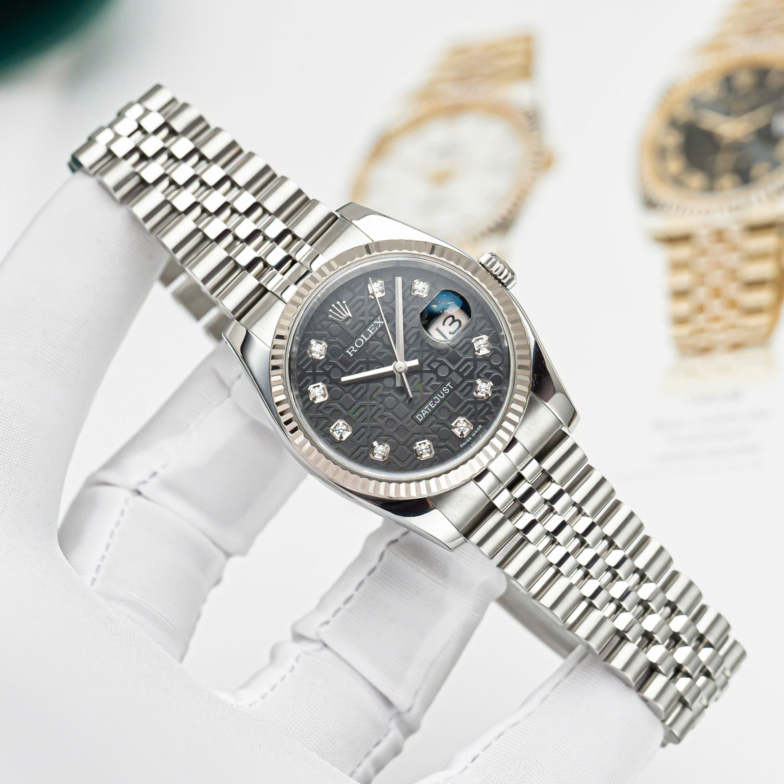 Mặt số đen vi tính được chế tác tinh xảo với họa tiết “ROLEX” lặp lại trên nền, tạo hiệu ứng ánh sáng tinh tế. Các cọc số đính kim cương tự nhiên được đặt thủ công tỉ mỉ, tôn lên vẻ sang trọng mà vẫn giữ nét nam tính trang nhã. Bộ hiển thị lịch ngày tại vị trí 3 giờ đi kèm ống kính phóng đại Cyclops, một biểu tượng đặc trưng của dòng Datejust.