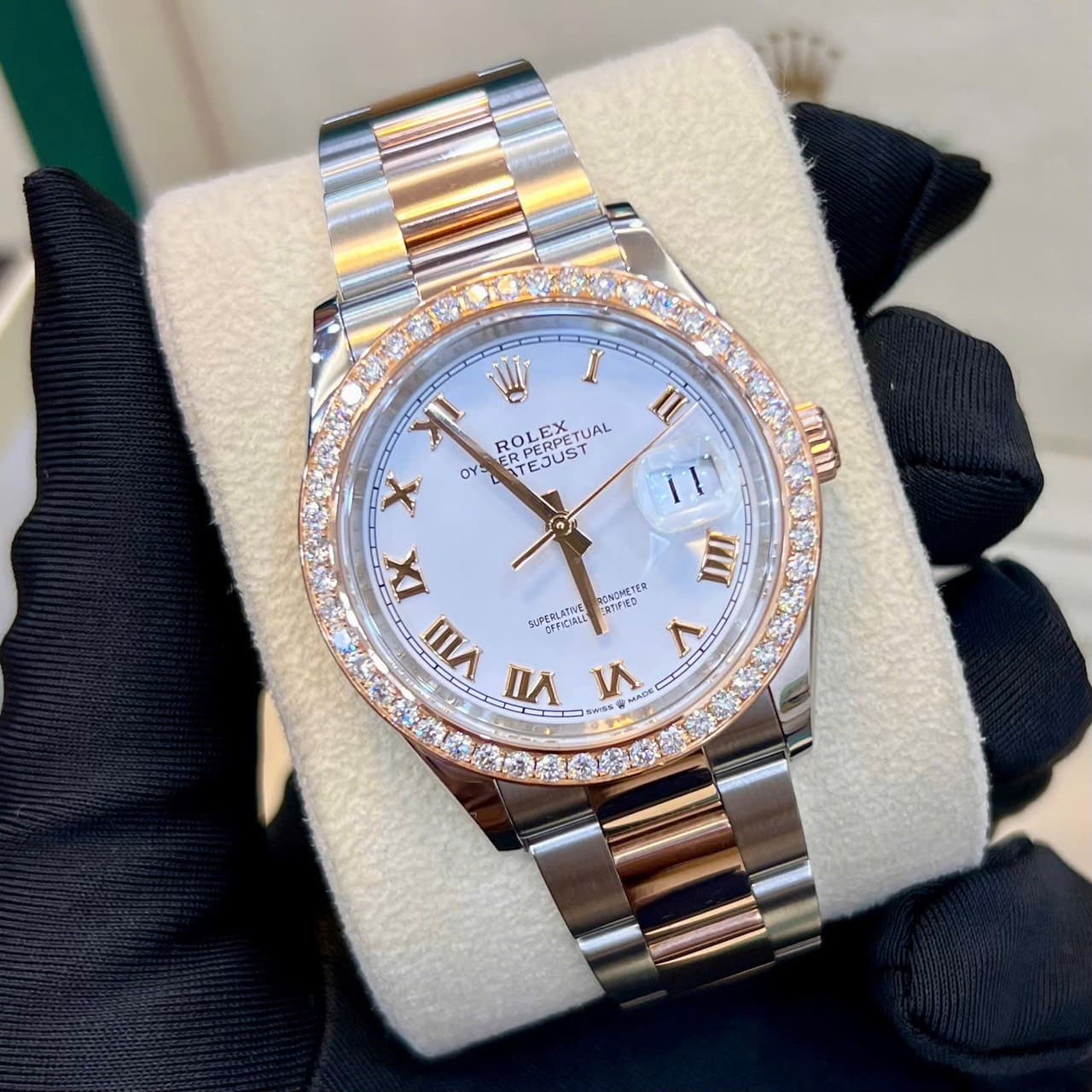 - Phiên bản Datejust 36mm với niềng kim cương thiên nhiên đính thủ công, tỏa sáng rực rỡ nhưng vẫn tinh tế.
