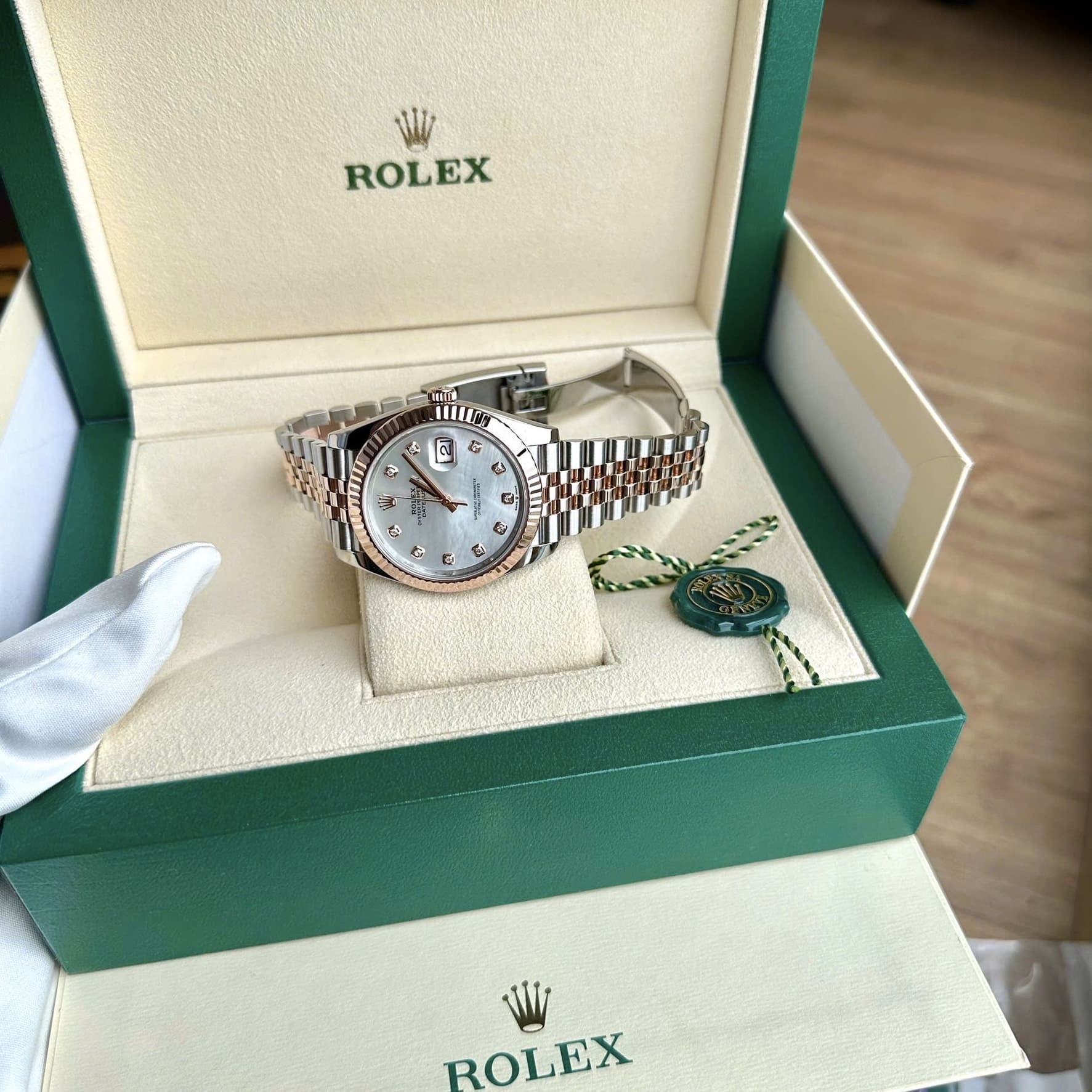 Mặt số xà cừ thiên nhiên (Mother of Pearl) mang hiệu ứng ánh sắc tự nhiên, mỗi chiếc là một cá thể độc bản. Các cọc giờ kim cương được Rolex tuyển chọn và nạm thủ công, đảm bảo độ tinh khiết và độ cân xứng tuyệt đối.