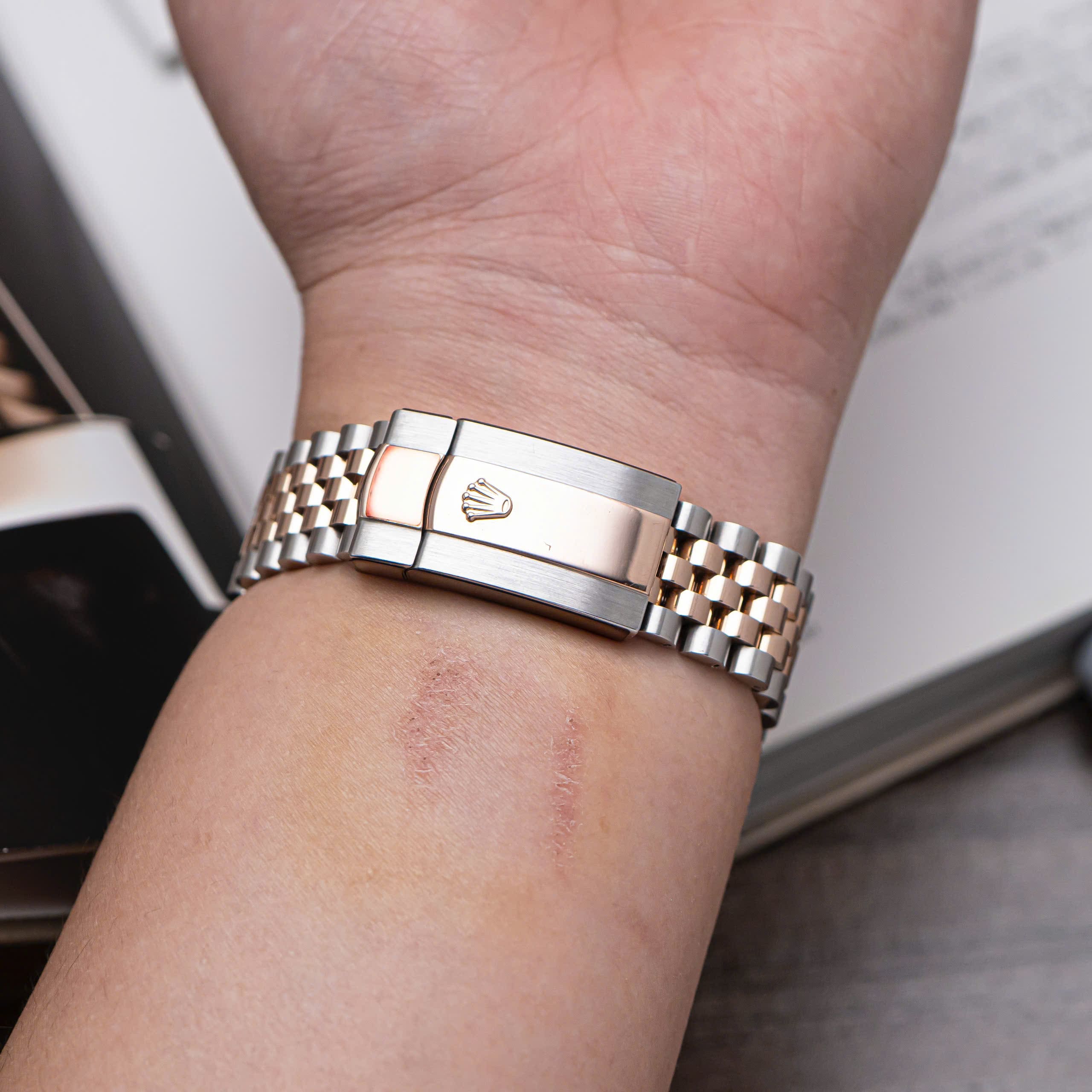 – Dây Jubilee Rolesor (thép & Everose) mang lại cảm giác đeo mềm mại và sang trọng.