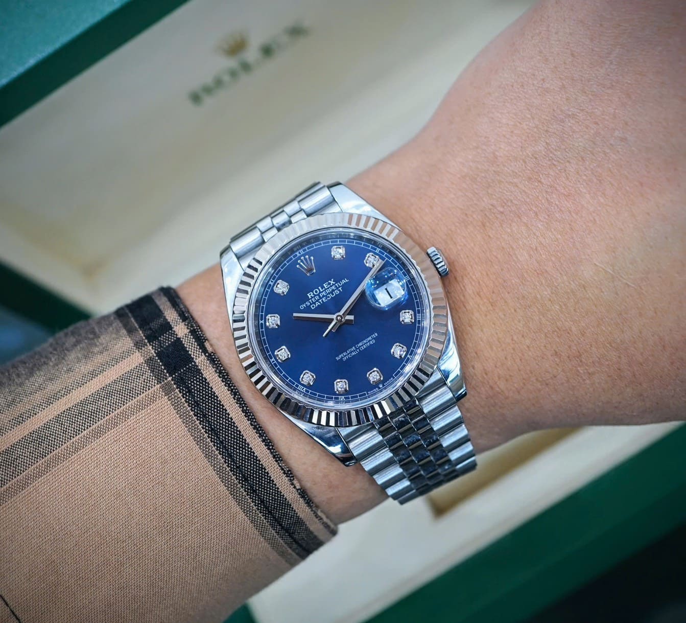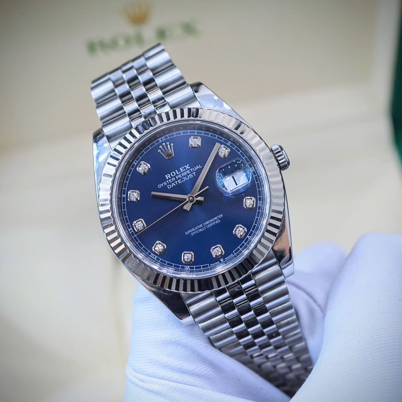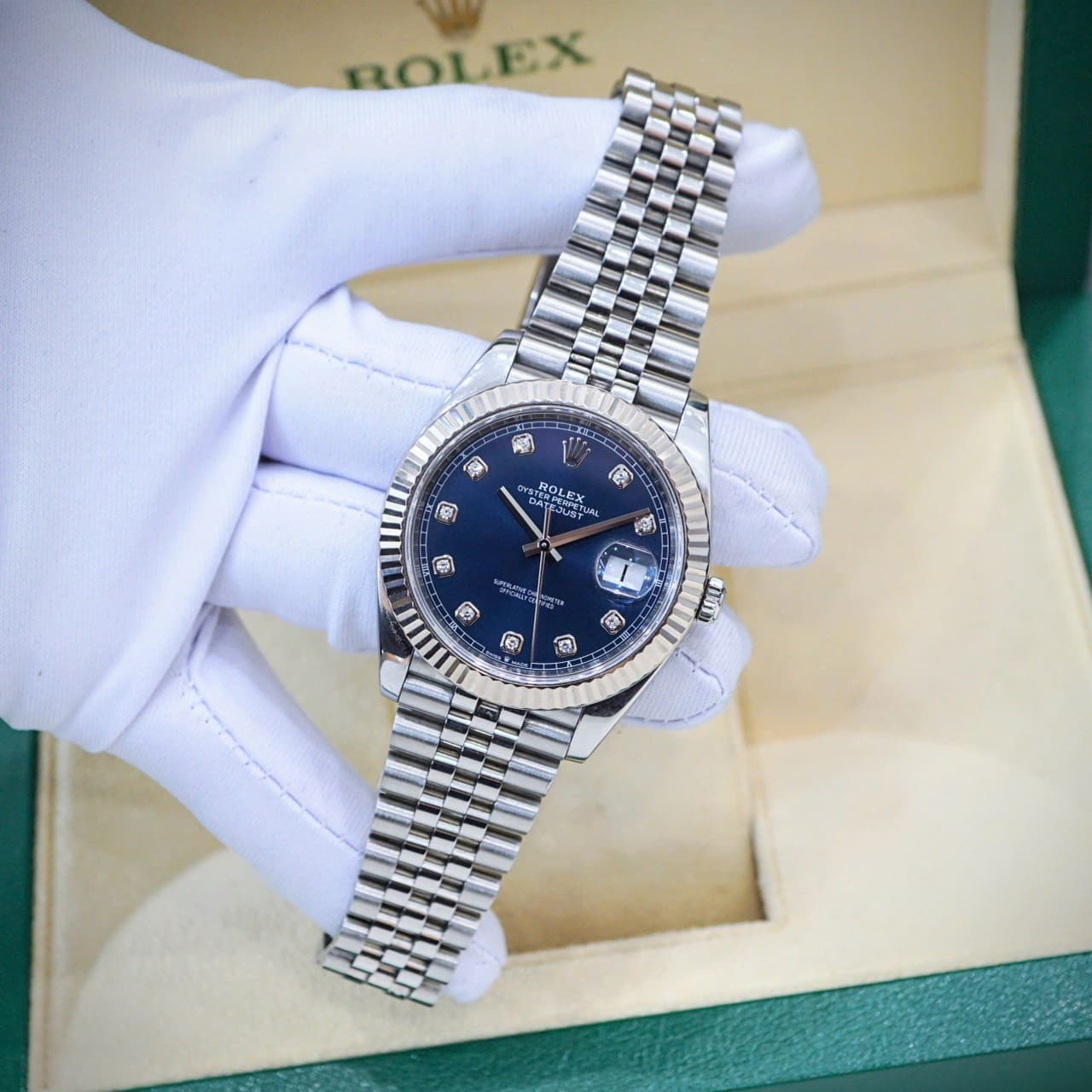 Mặt số xanh navy – gam màu được giới sưu tầm đặc biệt yêu thích – tỏa ra chiều sâu tinh tế dưới ánh sáng, làm nổi bật cọc số kim cương thiên nhiên lấp lánh cùng bộ kim baton sắc nét. Cửa sổ lịch ngày phóng đại Cyclops tại 3 giờ không chỉ tiện dụng mà còn là điểm nhận diện kinh điển của Rolex.