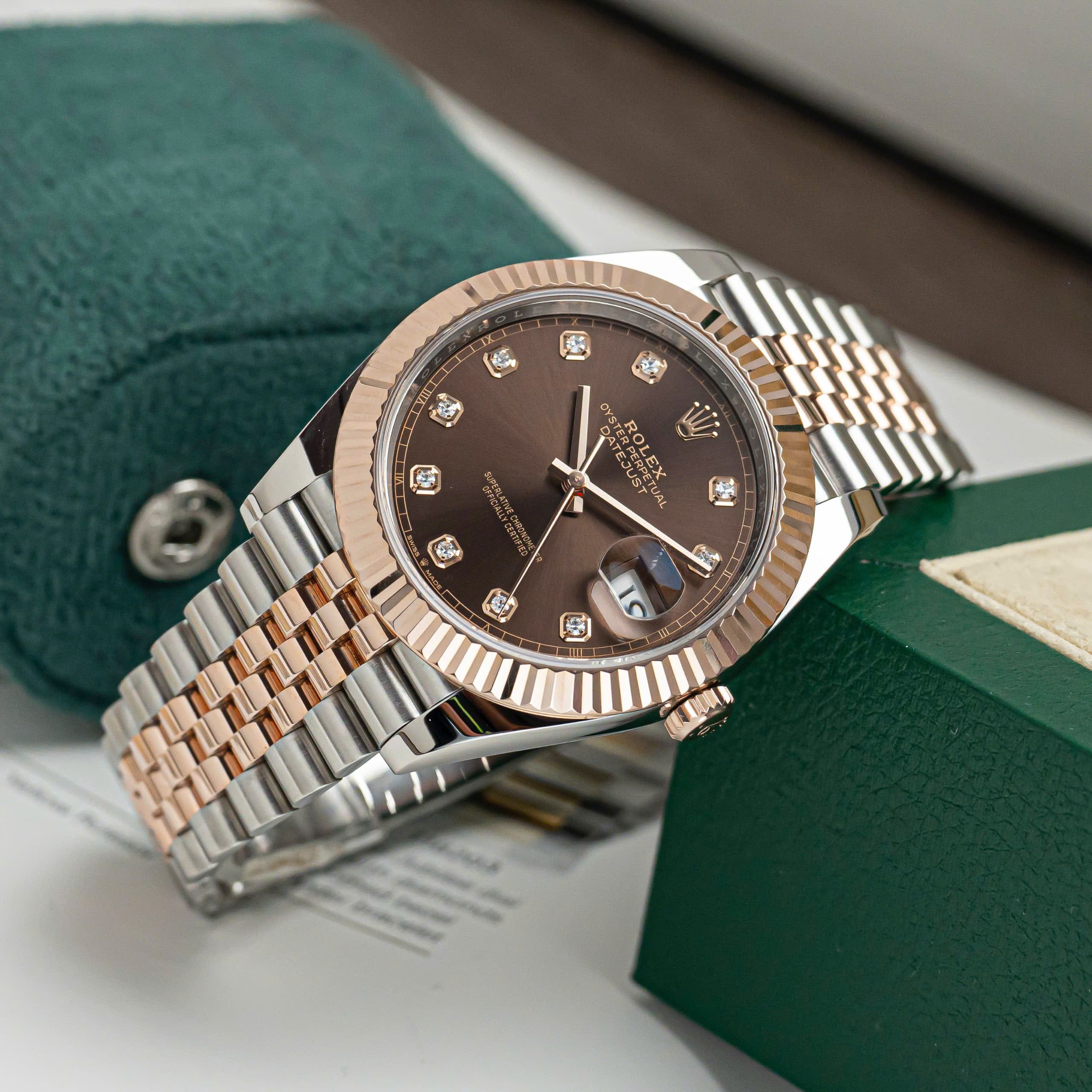 Mặt số chocolate nâu sẫm tạo chiều sâu quyến rũ, được tô điểm bằng 10 viên kim cương thiên nhiên đính trên cọc giờ vàng hồng, thể hiện sự xa xỉ nhưng không phô trương. Bên trong là bộ máy Calibre 3235 – chuẩn mực của độ chính xác, hiệu suất và độ bền, với khả năng trữ cót lên đến 70 giờ.