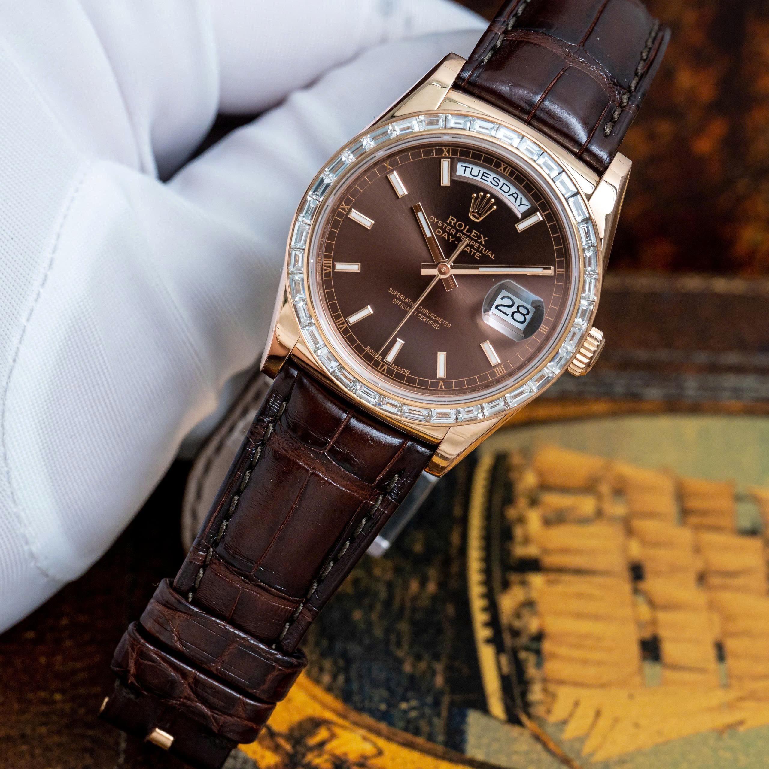 Rolex Day-Date 118135 Chocolate Diamond Baguette là lựa chọn dành cho những ai tìm kiếm sự quyền lực kín đáo nhưng đẳng cấp tuyệt đối.
