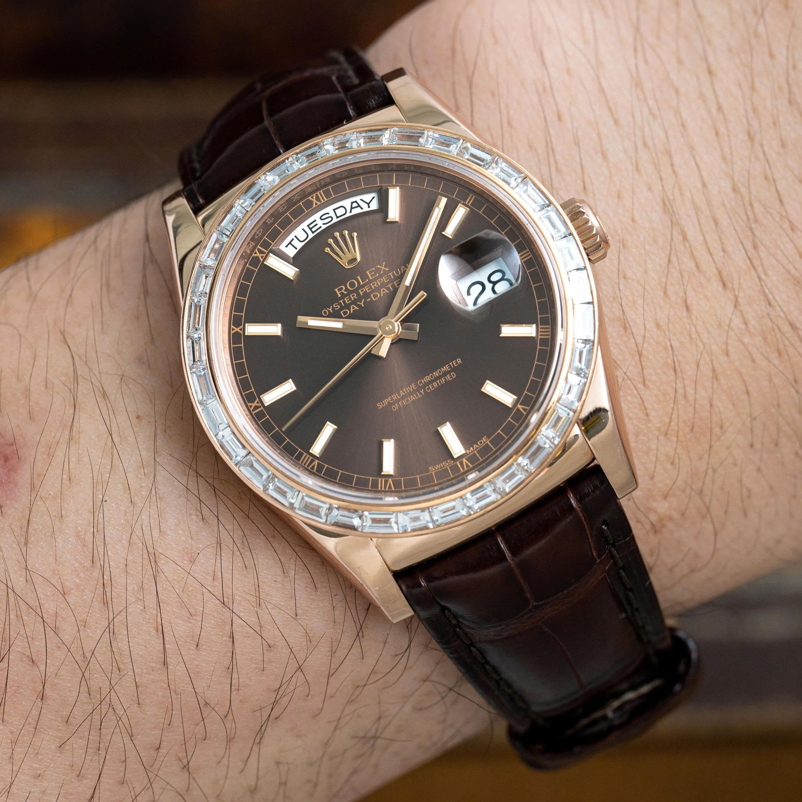 Day-Date vàng hồng luôn giữ vị thế cao trên thị trường thứ cấp. Các phiên bản mặt chocolate kết hợp diamond baguette càng hiếm và được giới sưu tầm săn tìm.