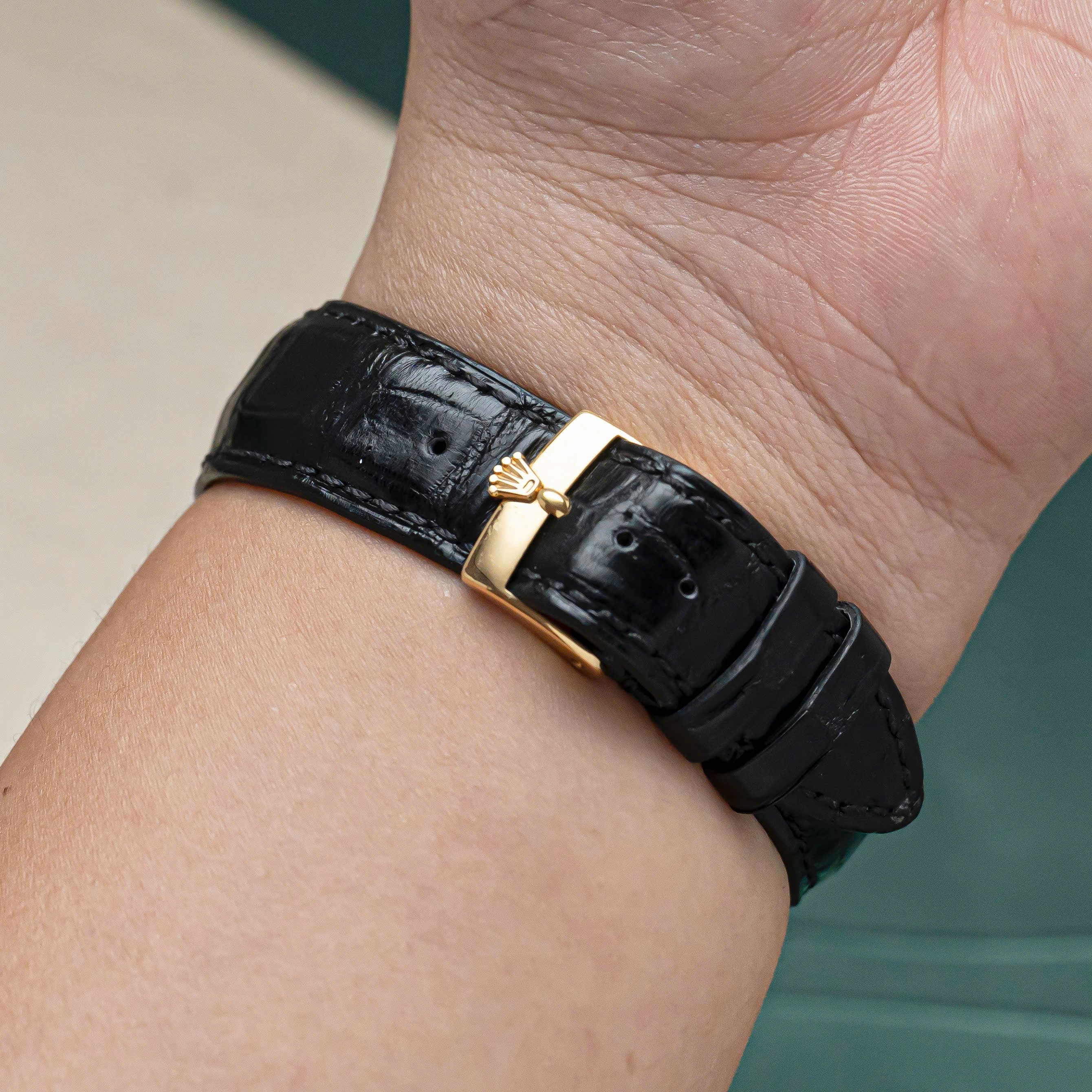 – Dây da cá sấu đen, phong cách dresswatch cổ điển.